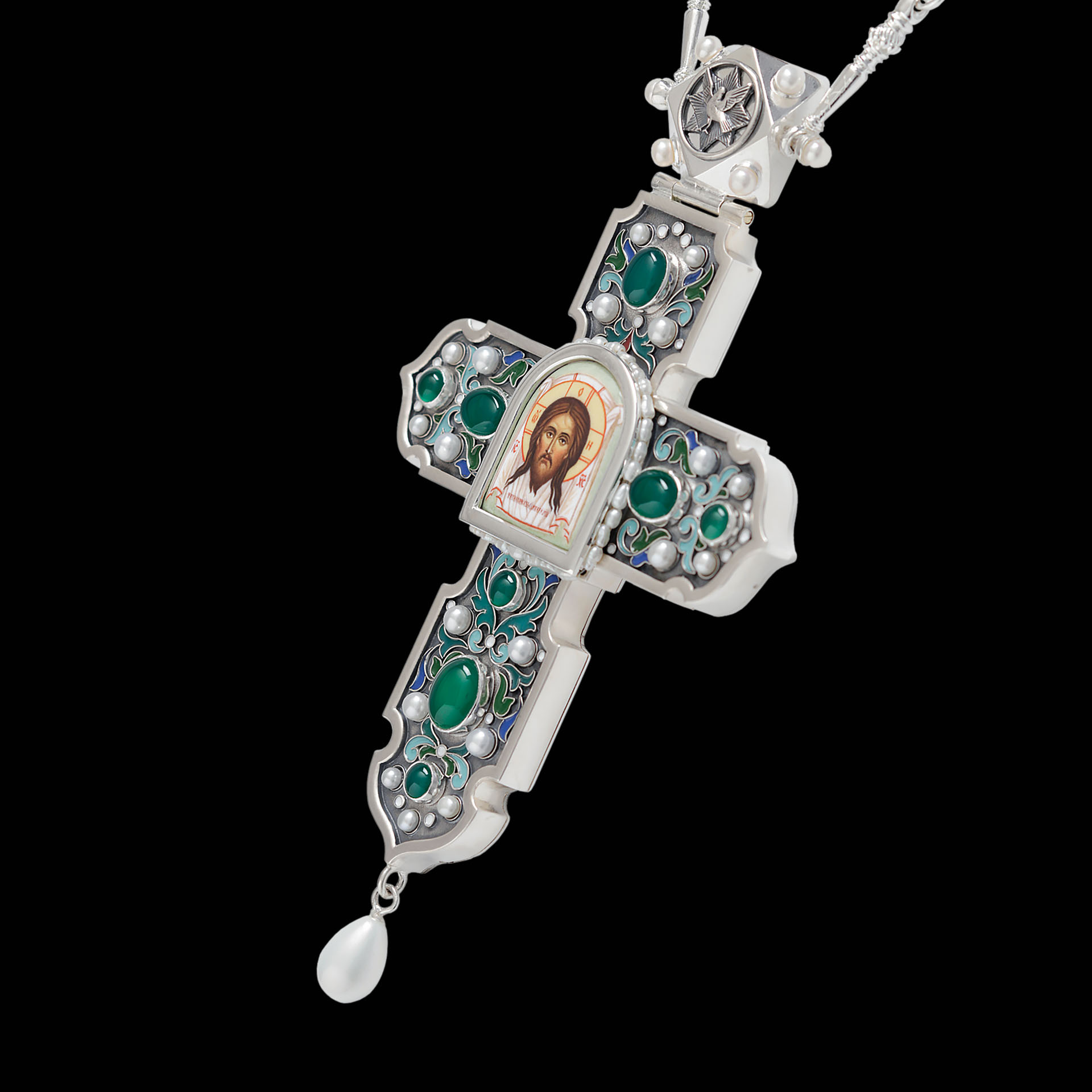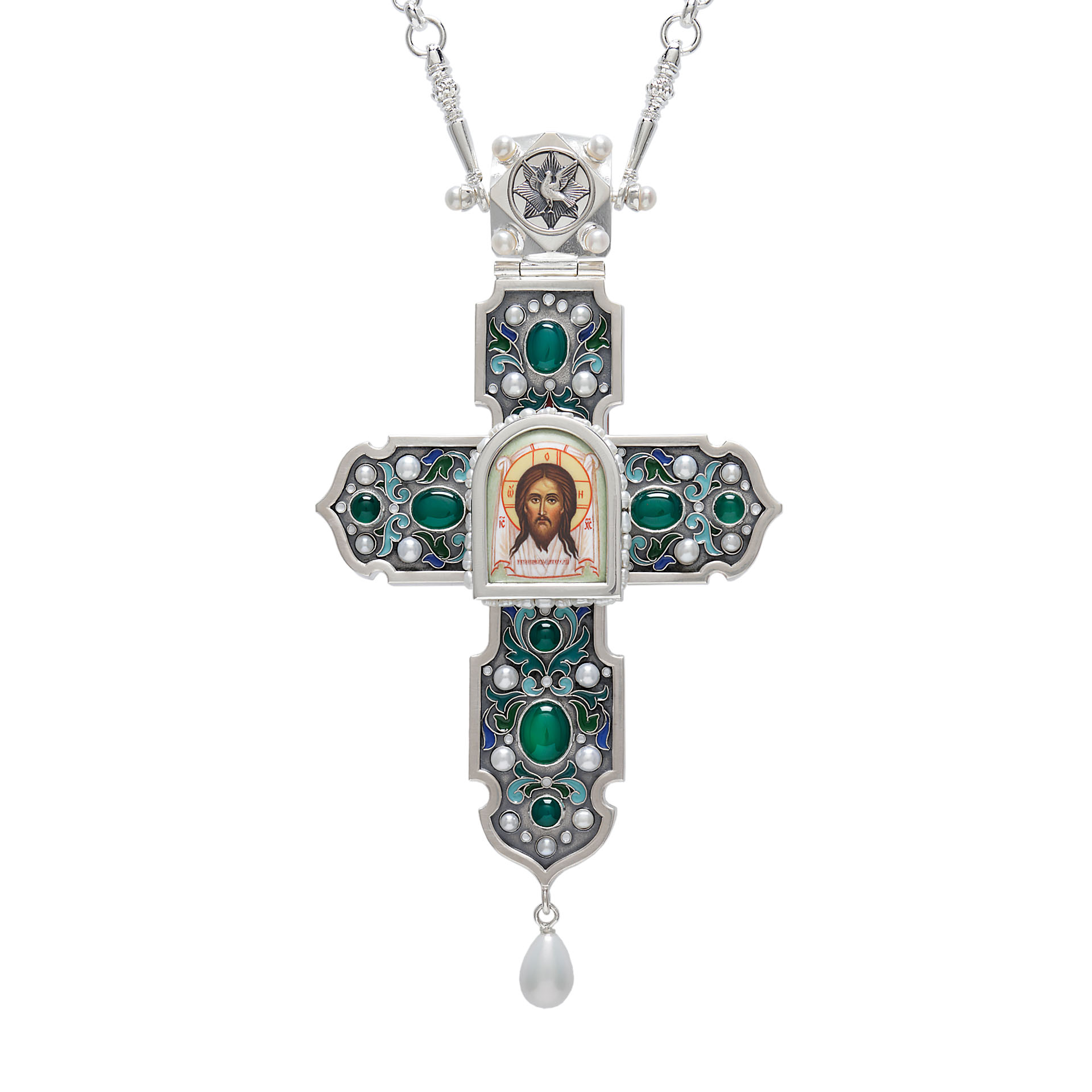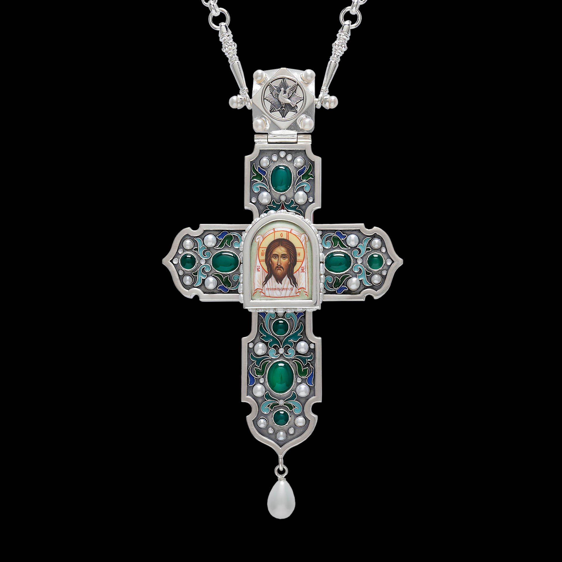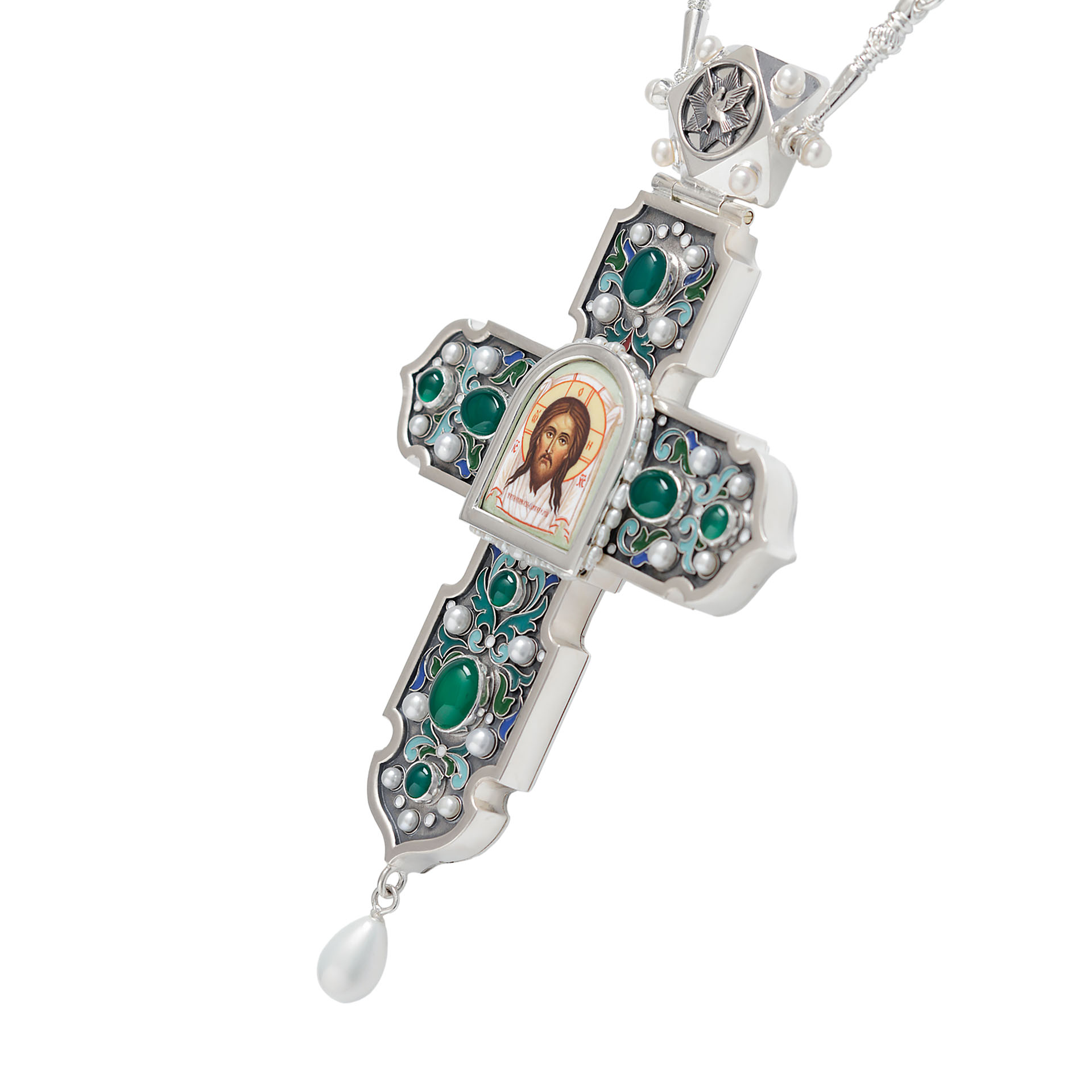 Крест архиерейский №1415 / Фианиты деколь, эмаль / серебрение