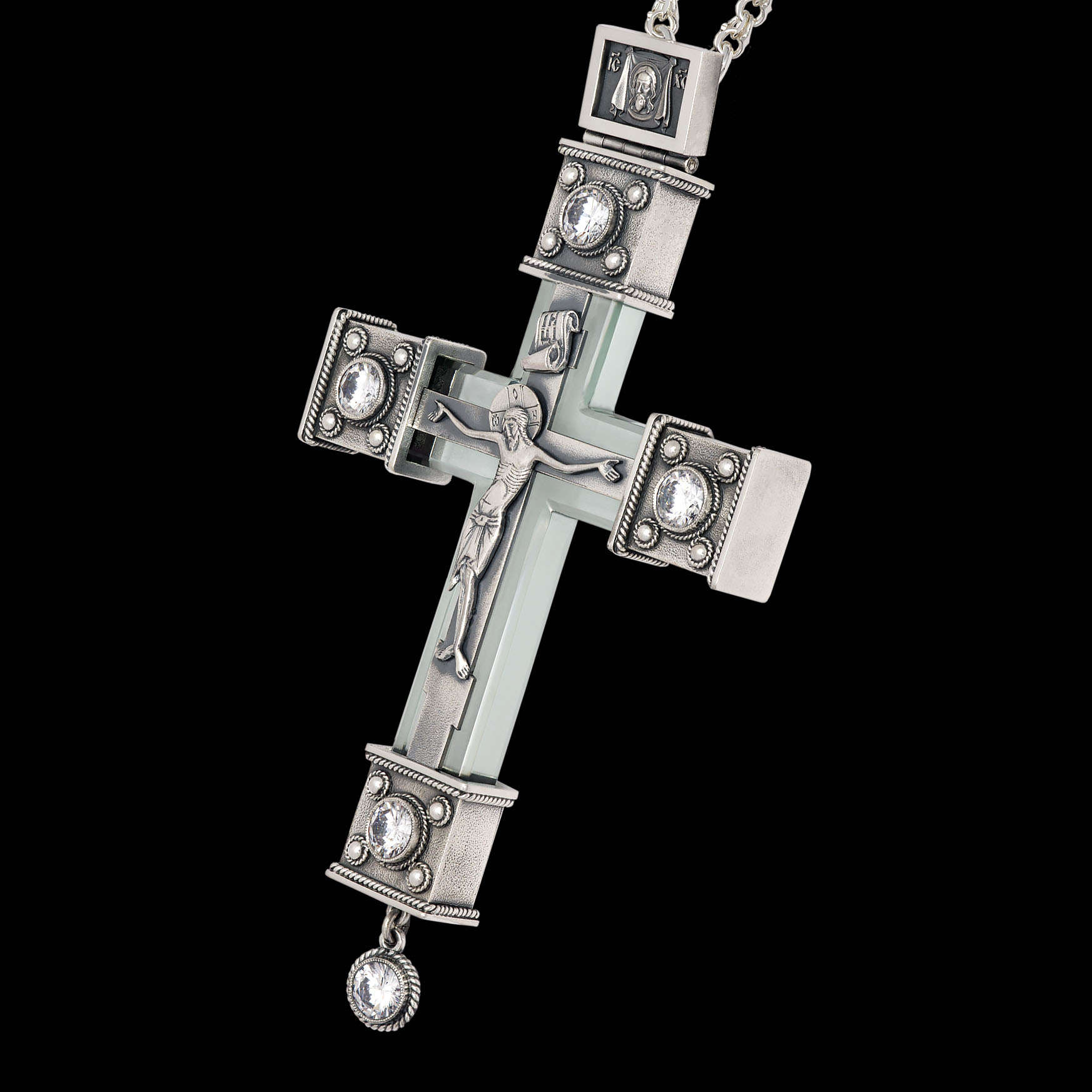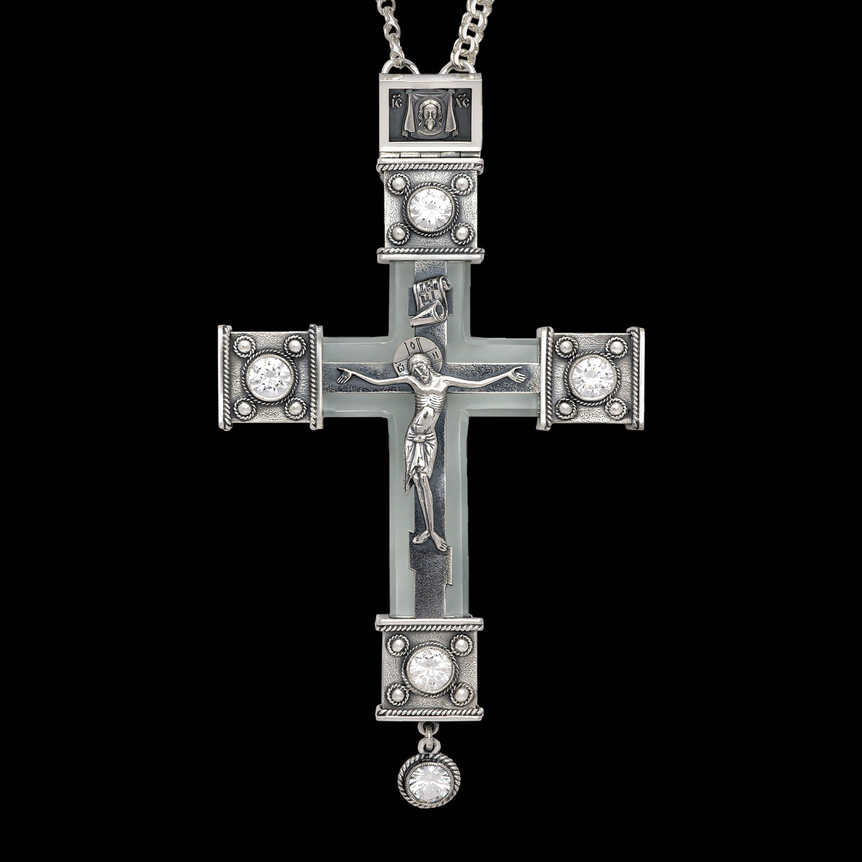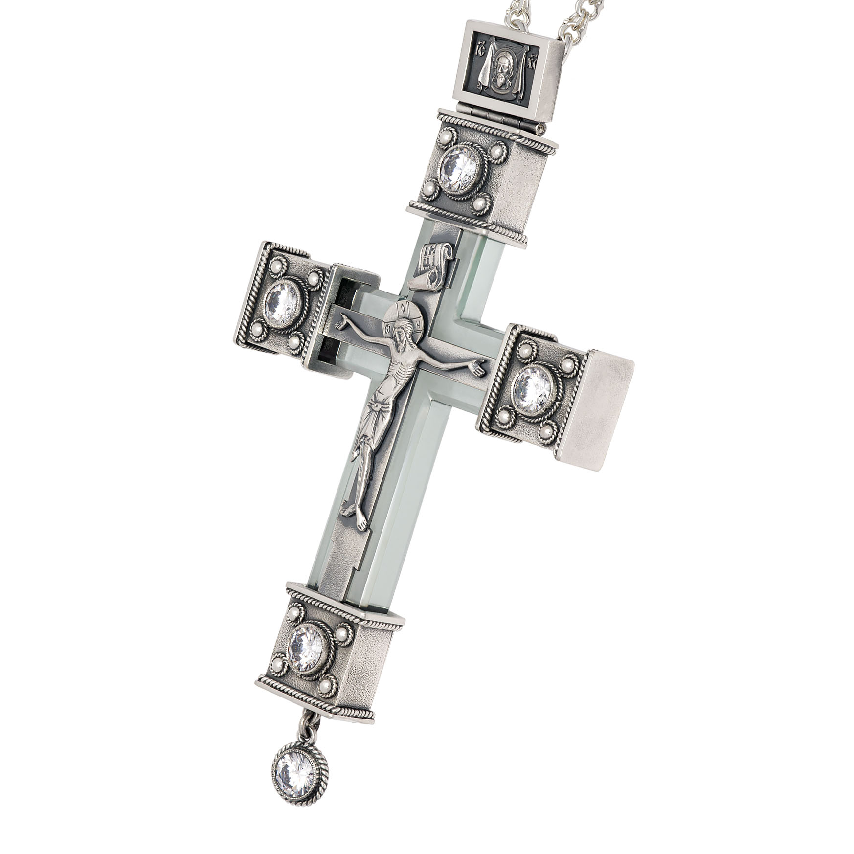 Крест архиерейский №1542 / Фианиты литьевое распятие серебро (УИН)