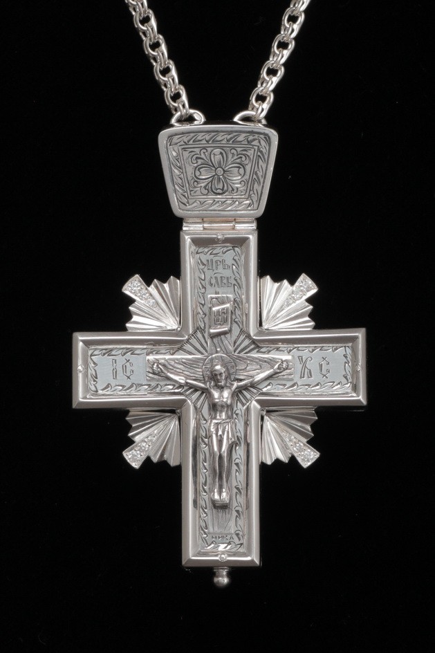 Крест архиерейский мощевик большой ручная гравировка, литьевое распятие №21 серебро (УИН)