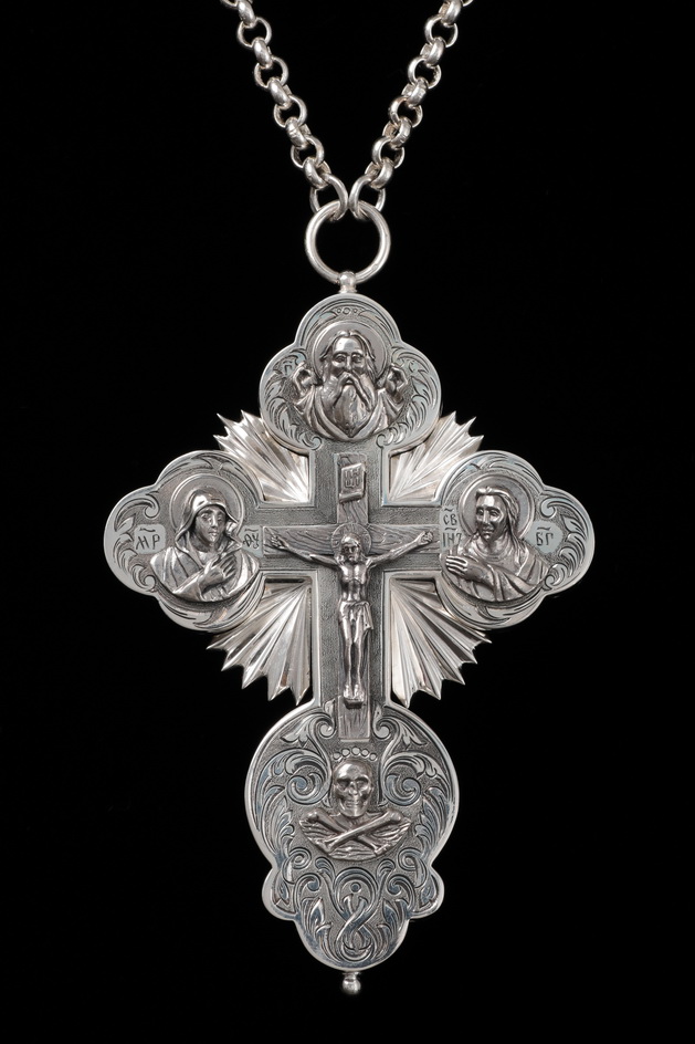 Крест архиерейский мощевик большой ручная гравировка, литьевые лики №17 серебро (УИН)