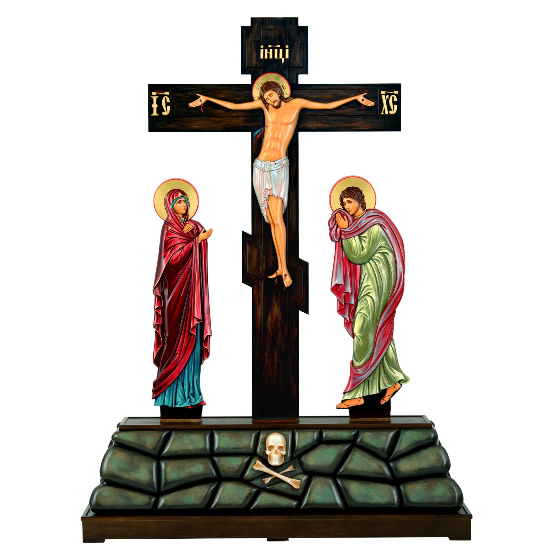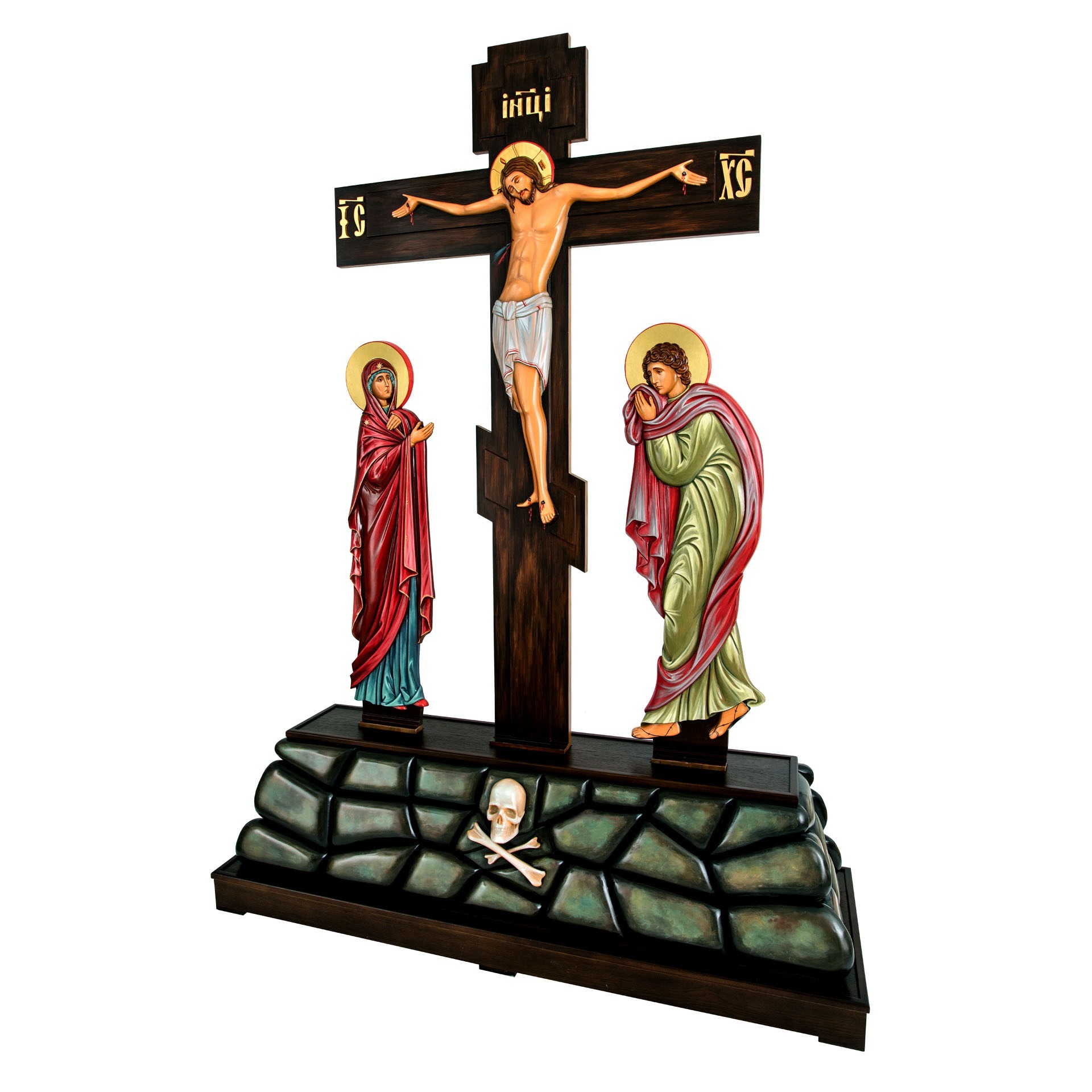Крест Голгофа резная, живописная с золоченым нимбом и буквами, резная гора, с предстоящими