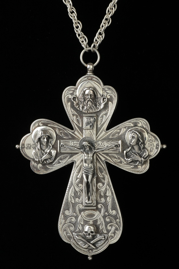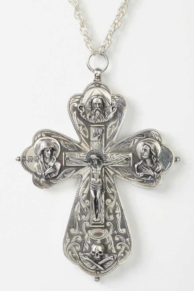 Крест мощевик большой ручная гравировка, литьевые лики №12 серебро (УИН)
