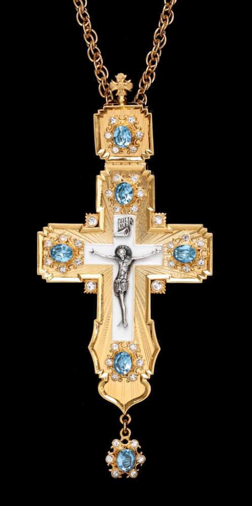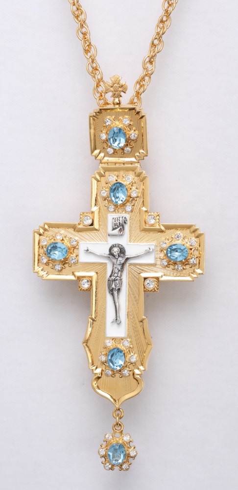 Крест наперсный №106 литьевое распятие, эмаль, гильяш / золочение, серебрение