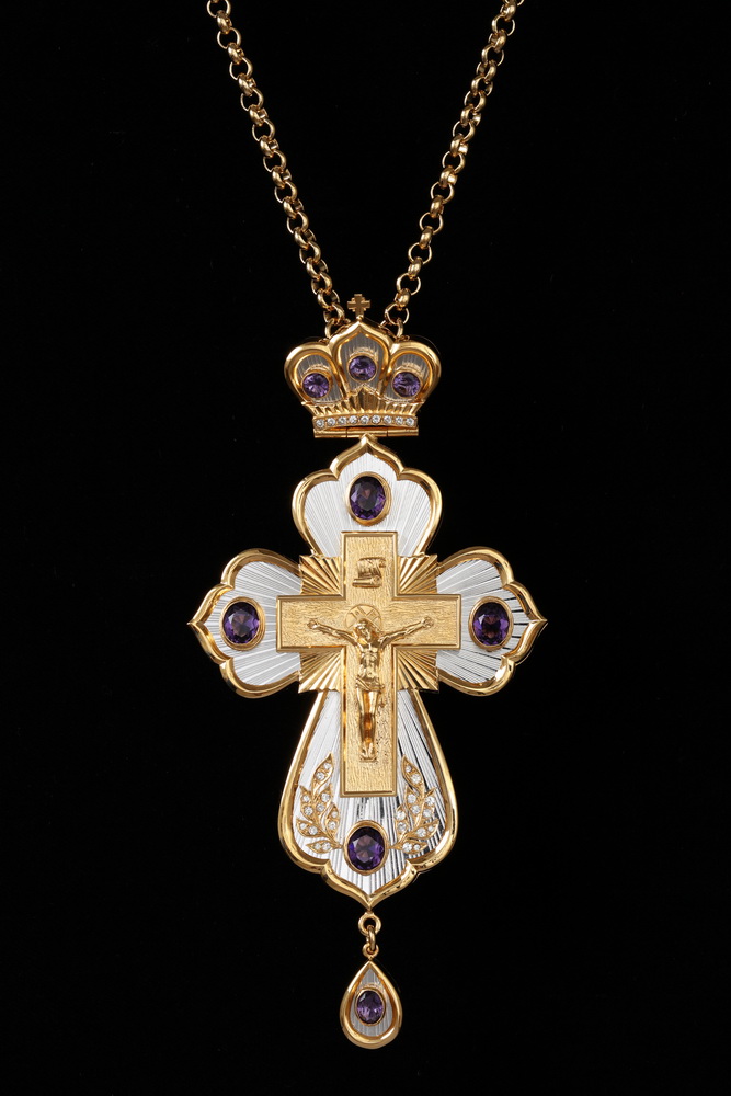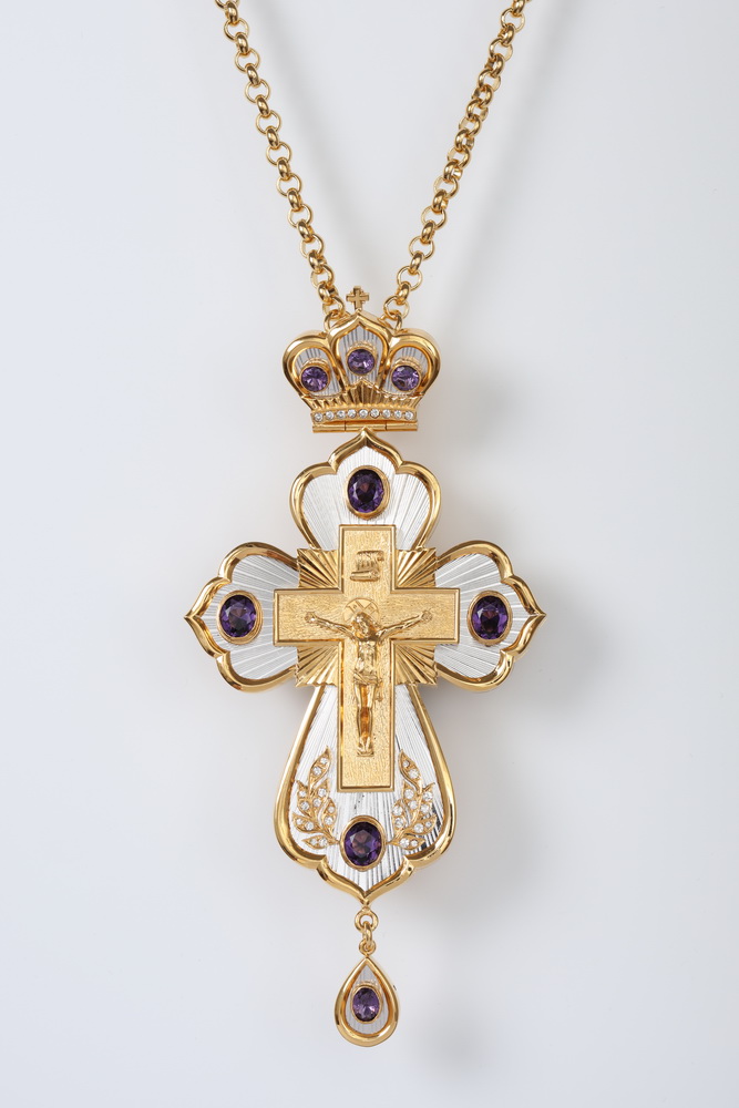 Крест наперсный №1070 юбилейный, литьевое распятие, гильяш / золочение, серебрение