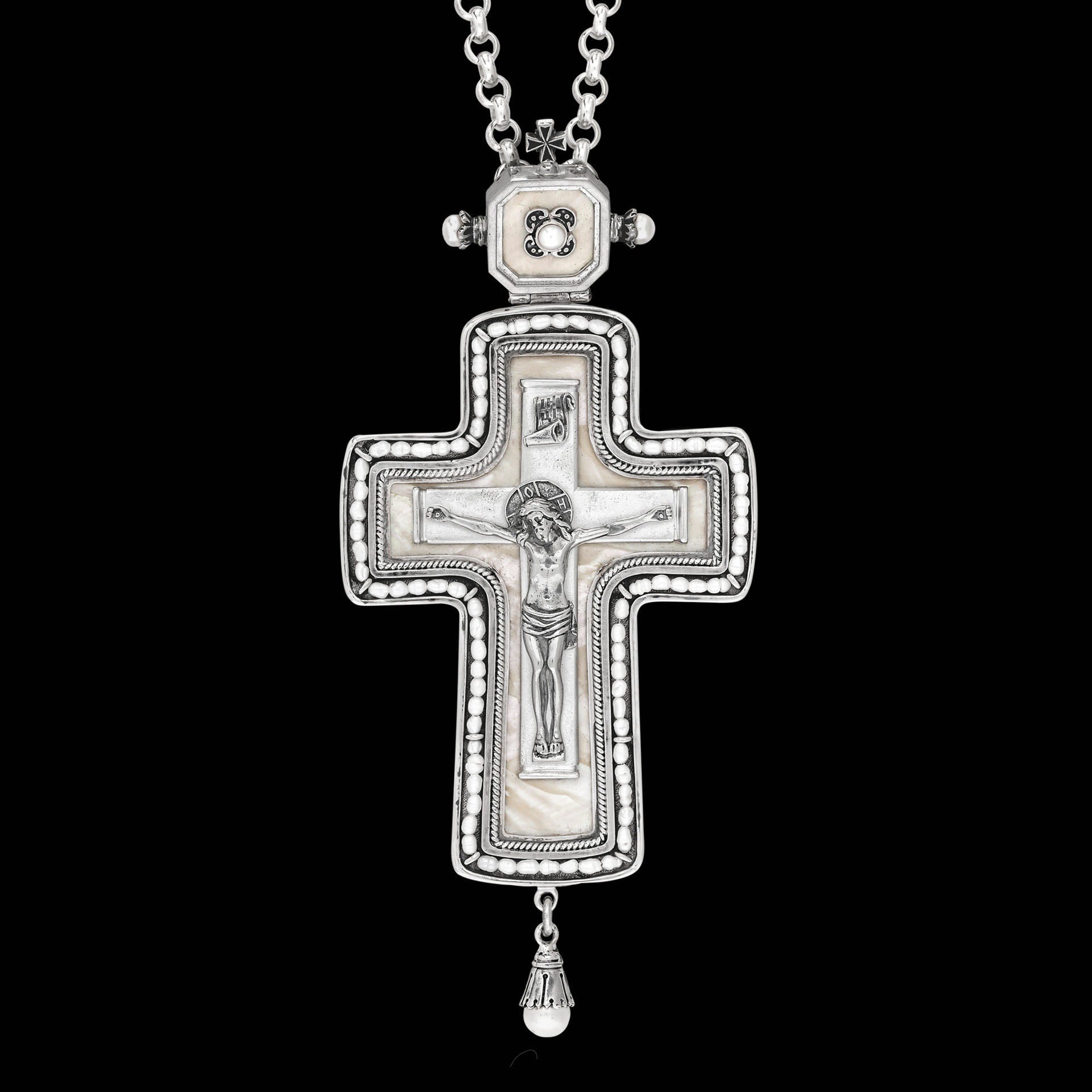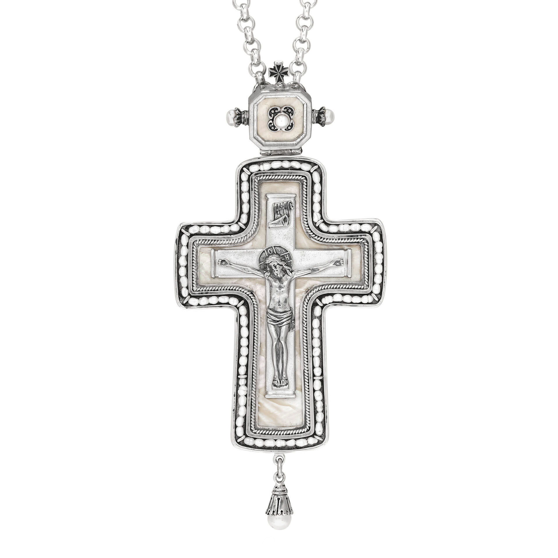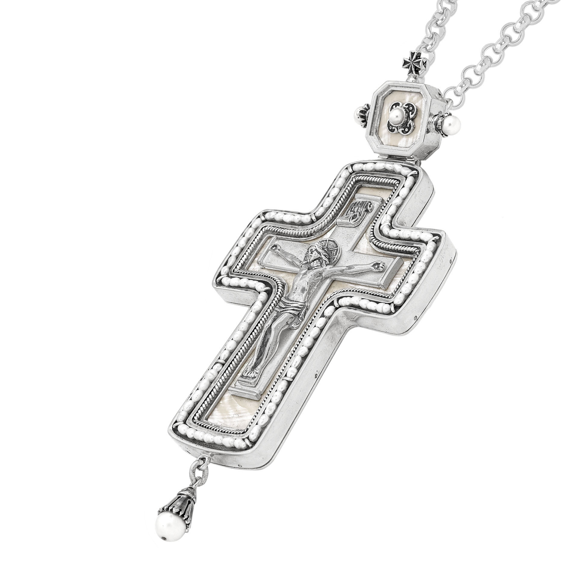 Крест наперсный №185 литьевое распятие, перламутр / серебрение