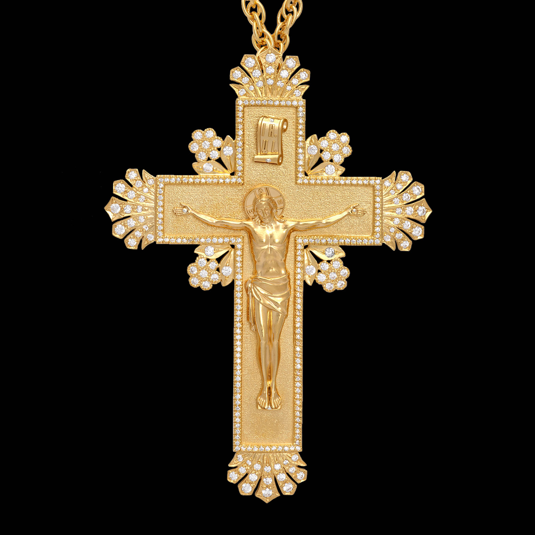 Крест наперсный №223 / Фианиты литьевое распятие / золочение / серебро (УИН)