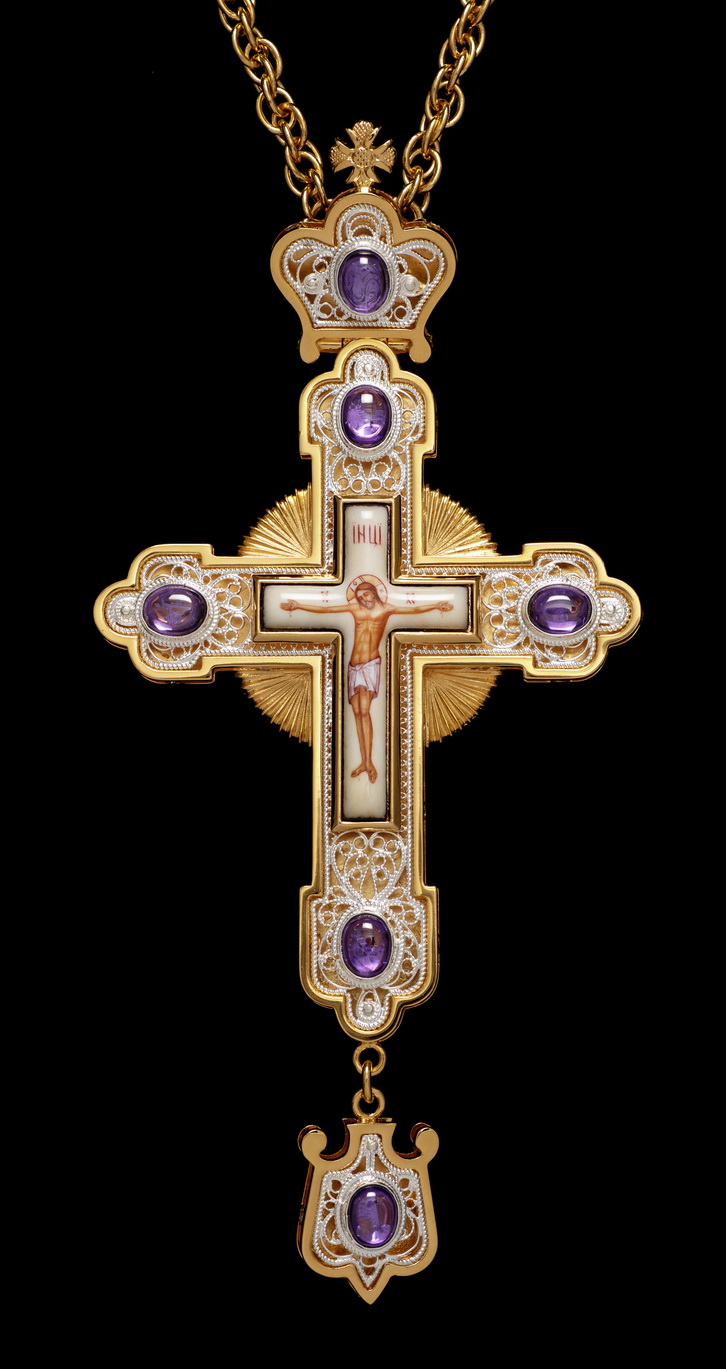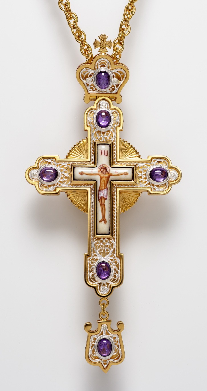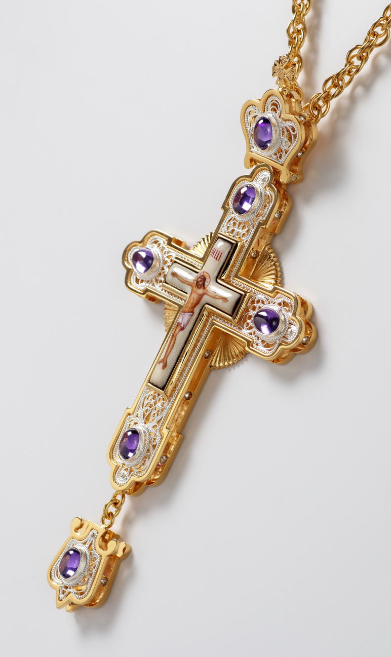 Крест наперсный филигрань №0025 / Фианиты трифоновский двойной рант, финифть / золочение, серебрение