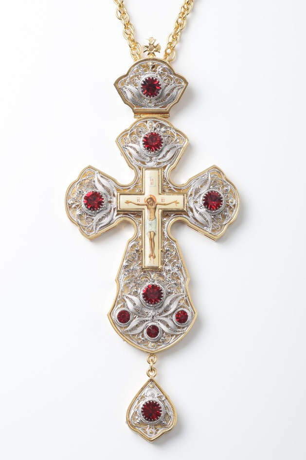 Крест наперсный филигрань №0031 двойной рант, узор, живопись / золочение, серебрение