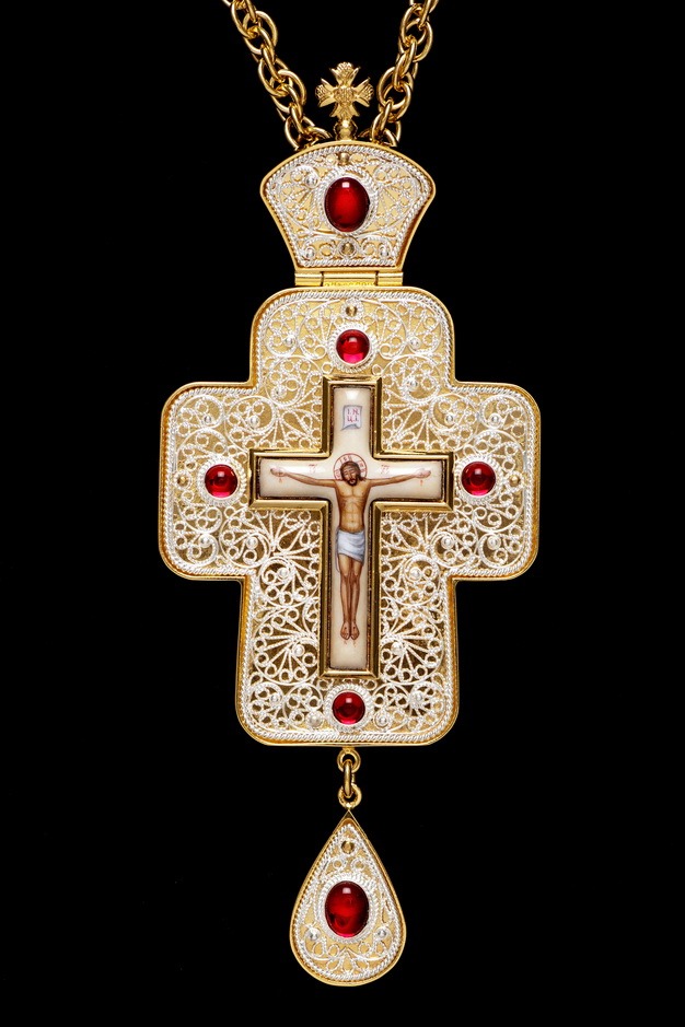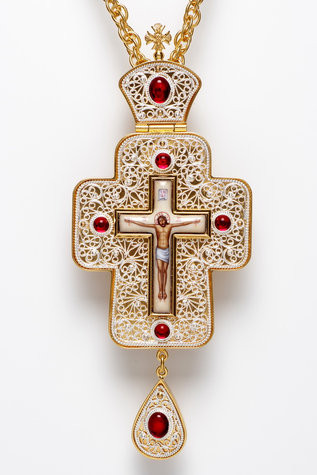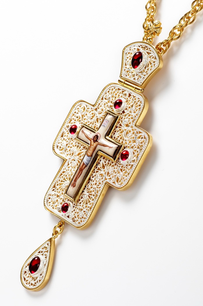 Крест наперсный филигрань №0034 одинарный рант, финифть / золочение, серебрение