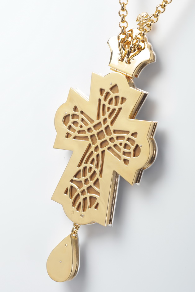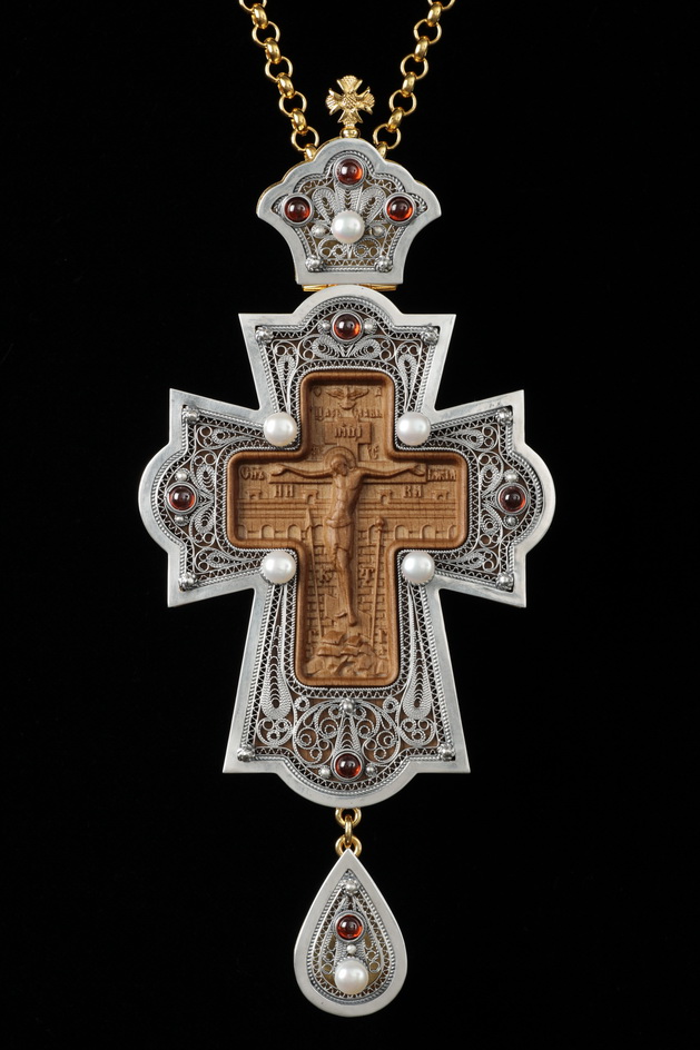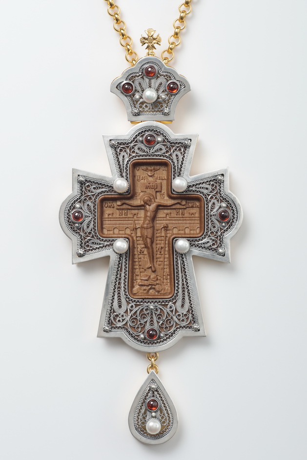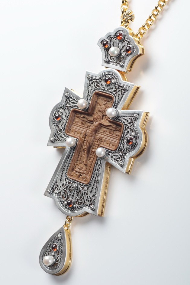 Крест наперсный филигрань №0035 / Ф двойной рант, коробка, узор, резьба по дереву / золочение, серебрение