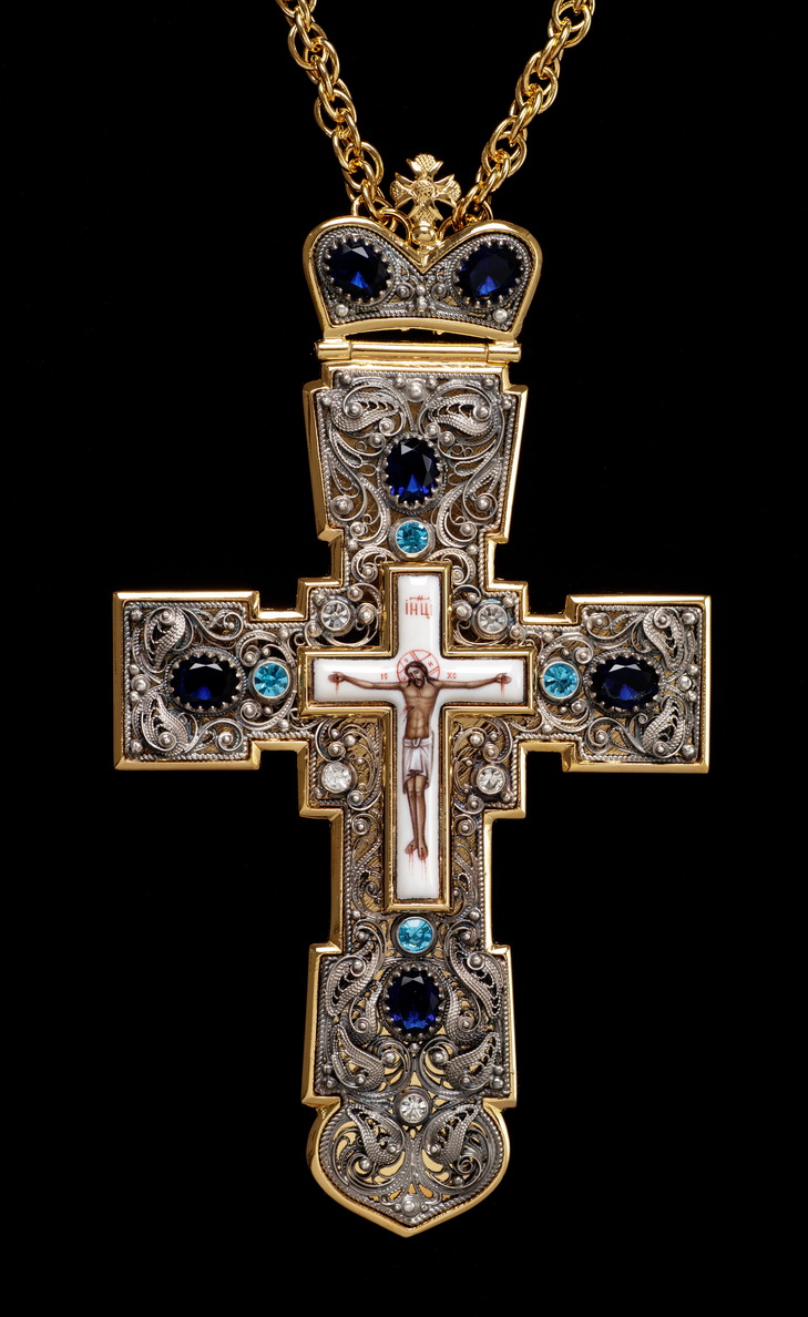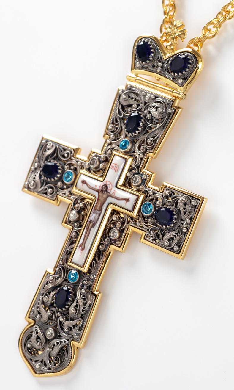 Крест наперсный филигрань №0038 одинарный рант, финифть / золочение, серебрение