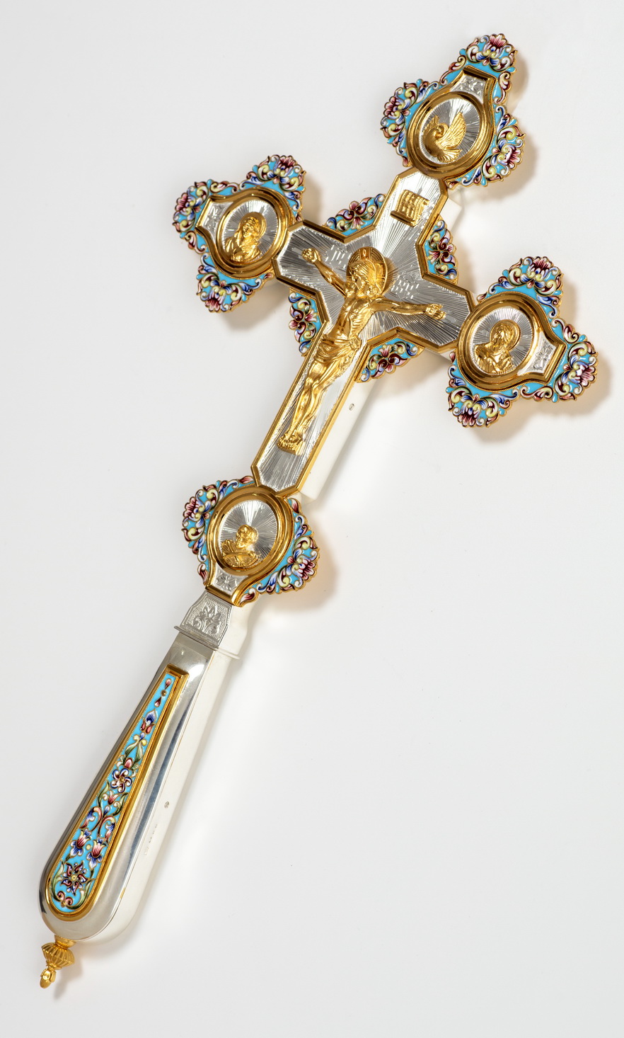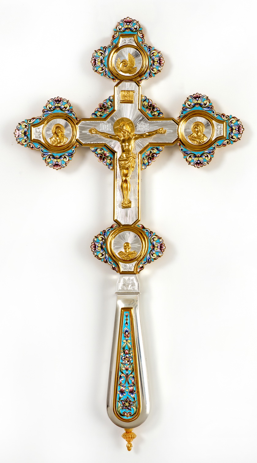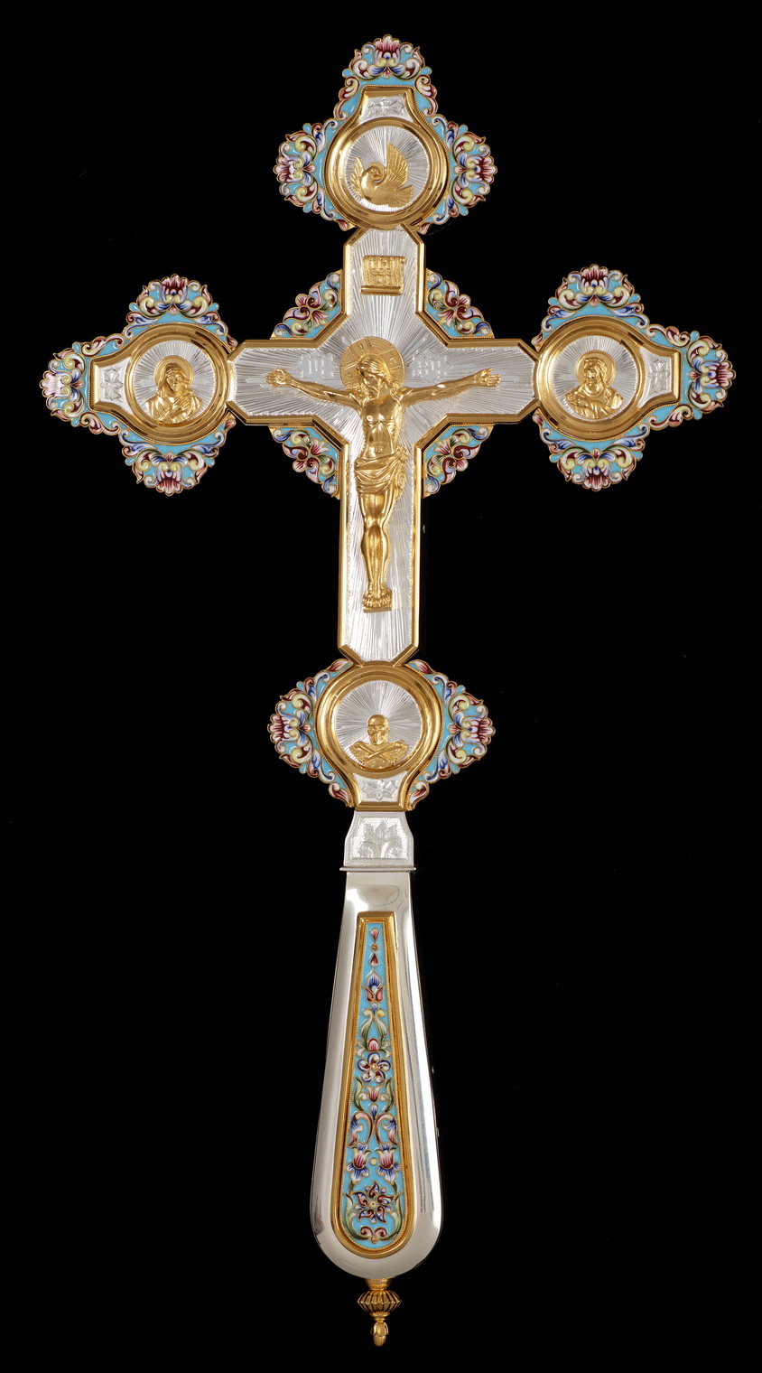 Крест напрестольный №1 рант, литье, филигрань, эмаль, роспись, гравировка / золочение / серебро (УИН)
