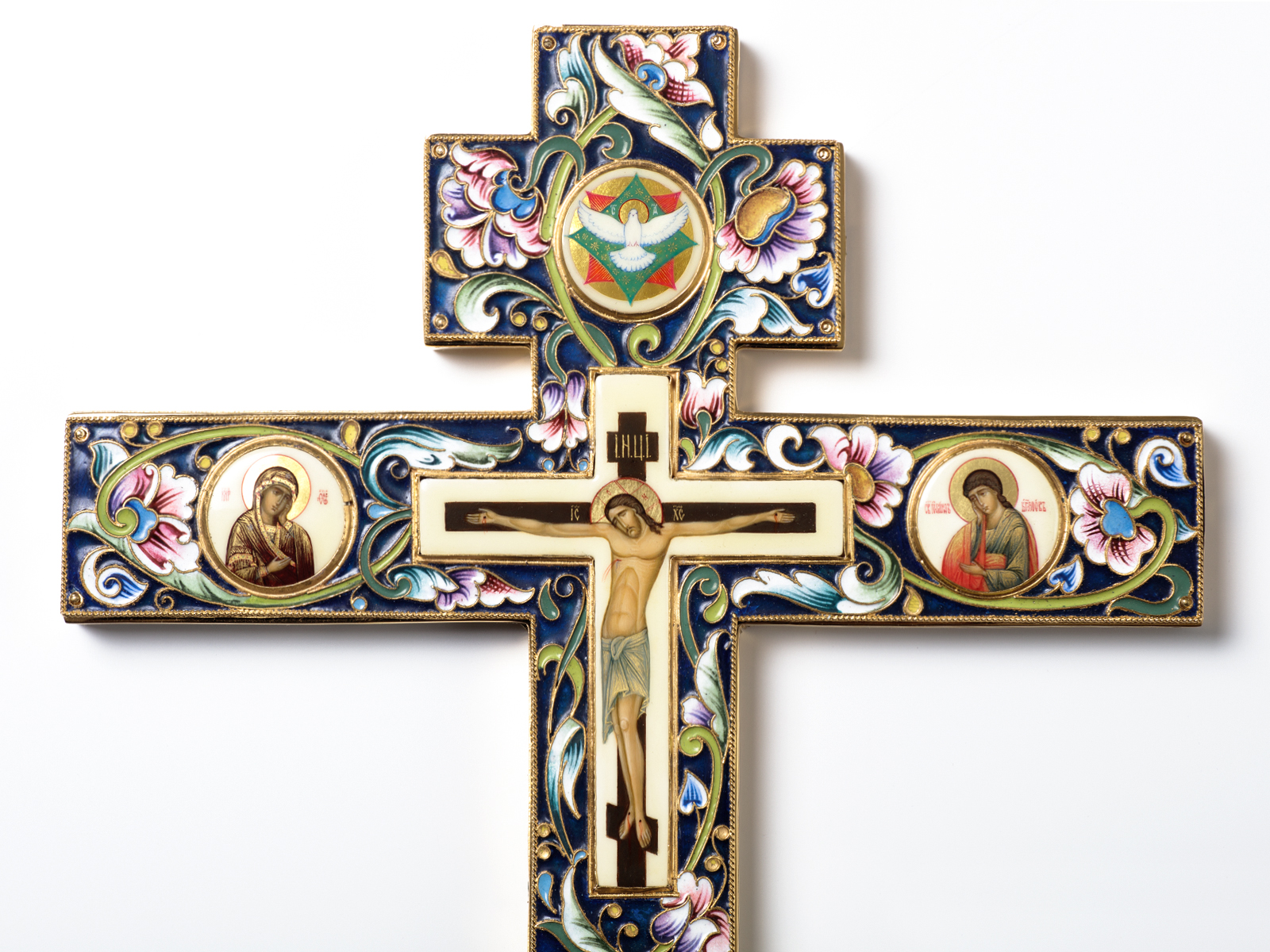 Крест напрестольный №3 5-живописей, филигрань, эмаль, роспись, хим.гравировка / золочение