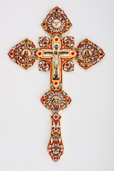 Крест напрестольный №4 5-финифтей, филигрань, эмаль, хим.гравировка / золочение