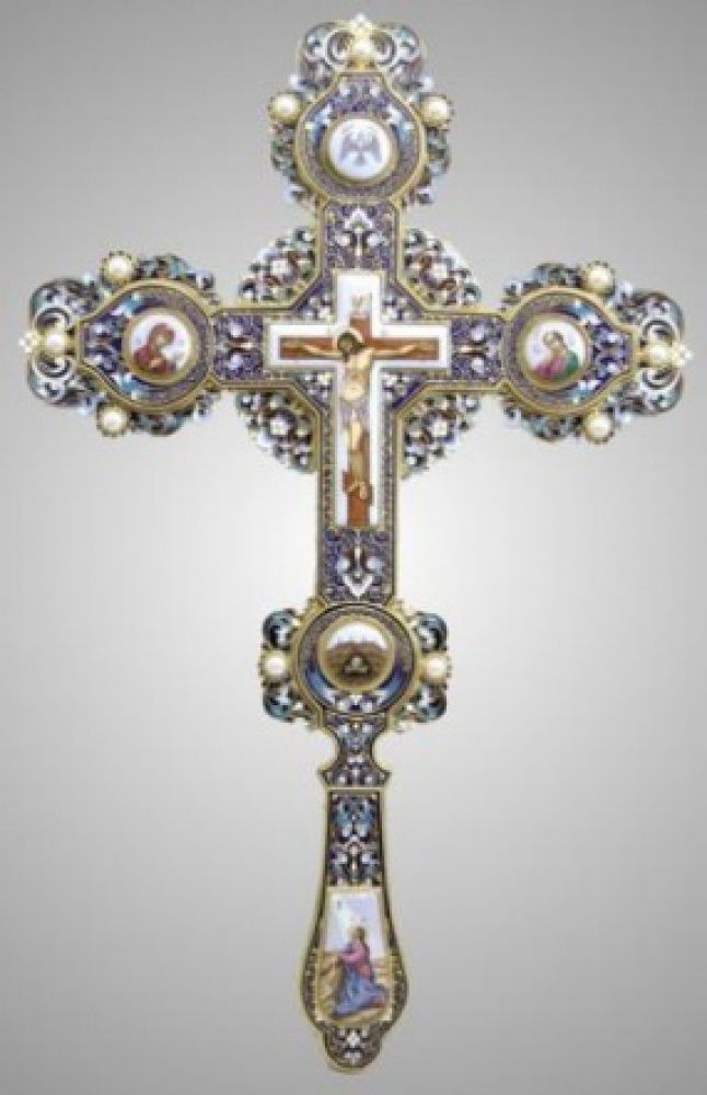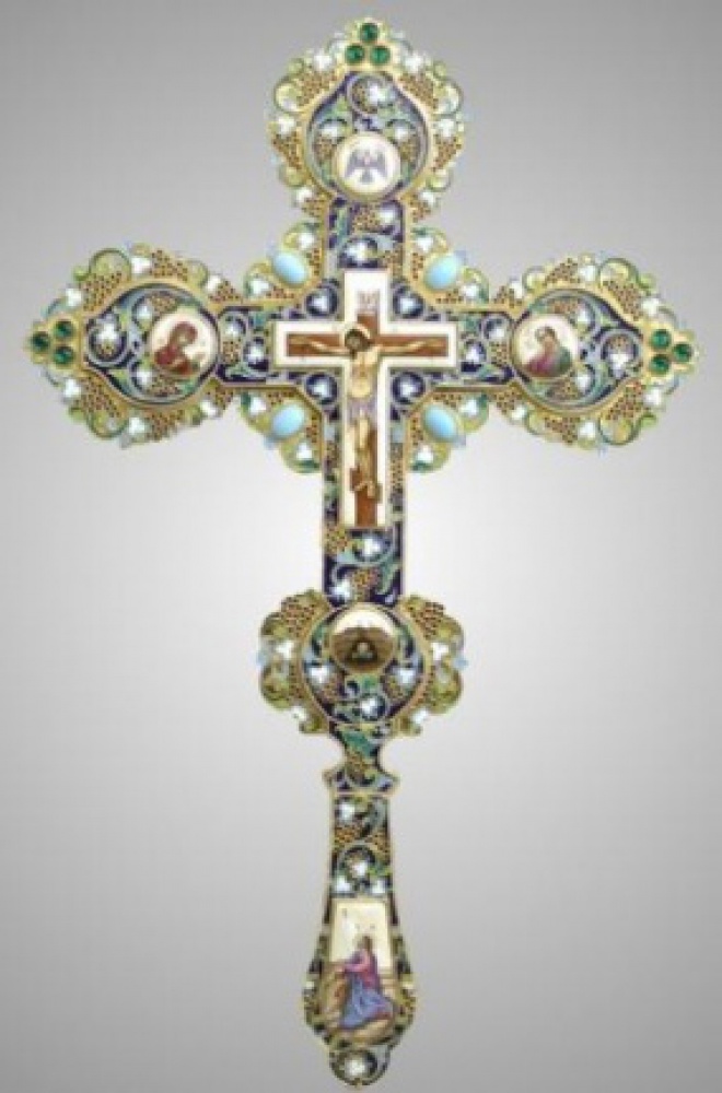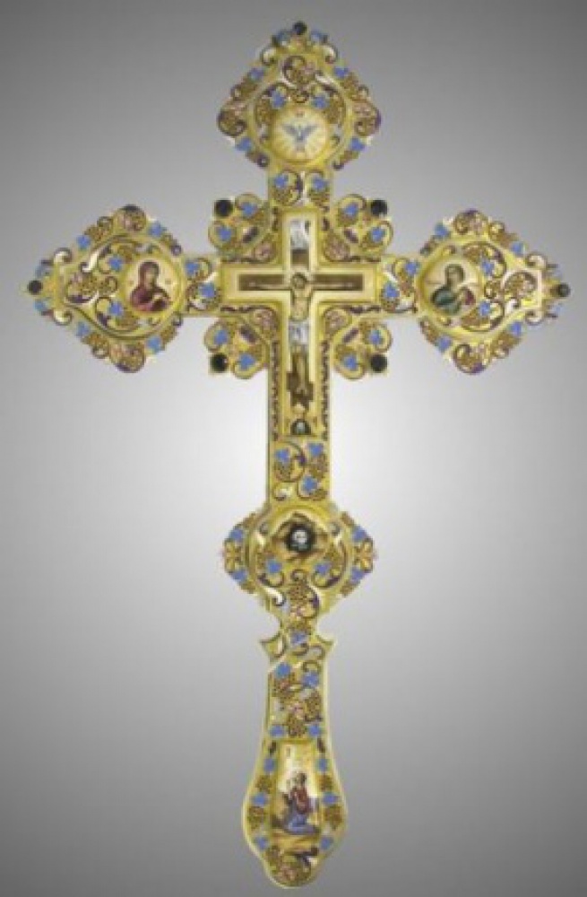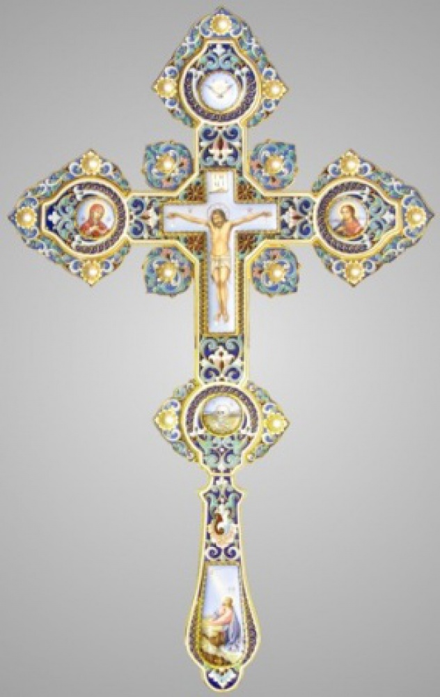 Крест напрестольный №4 6-финифтей, филигрань, эмаль, хим.гравировка / золочение