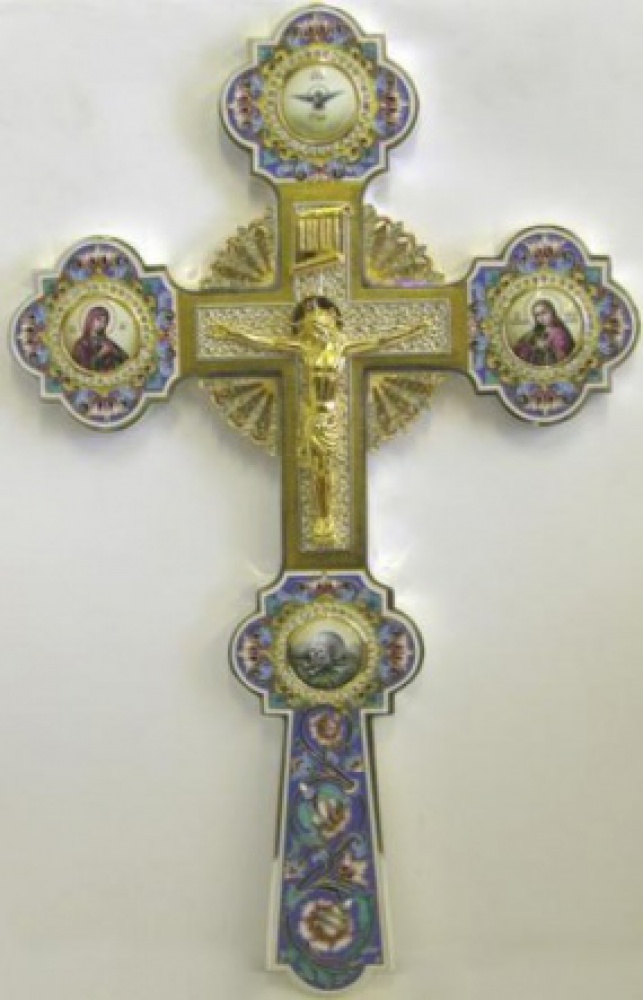Крест напрестольный 4-финифти, распятие, лучи, гравировка, филигрань, эмаль, роспись / золочение / серебро (УИН)
