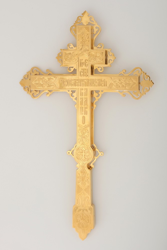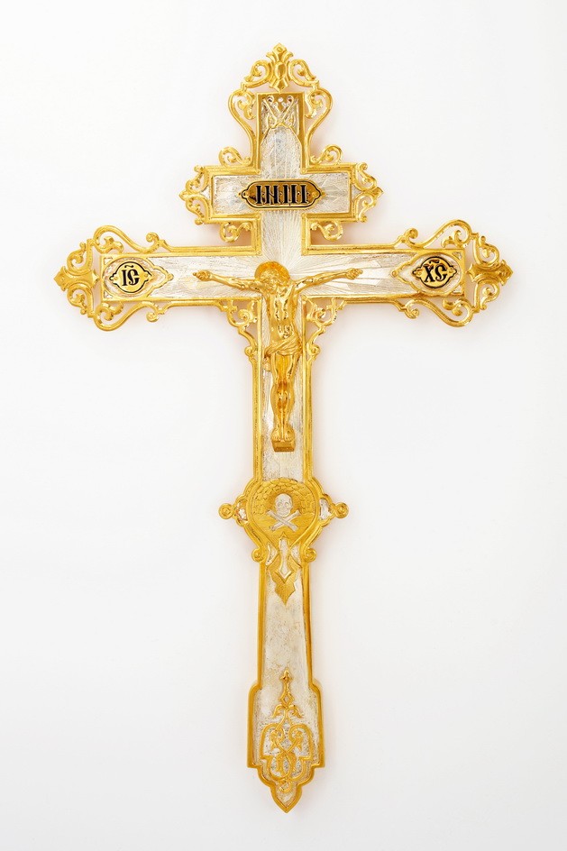 Крест напрестольный №4 рант, литьевое распятие, эмаль, гравировка / золочение, серебрение