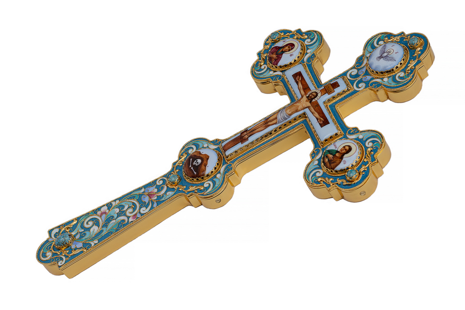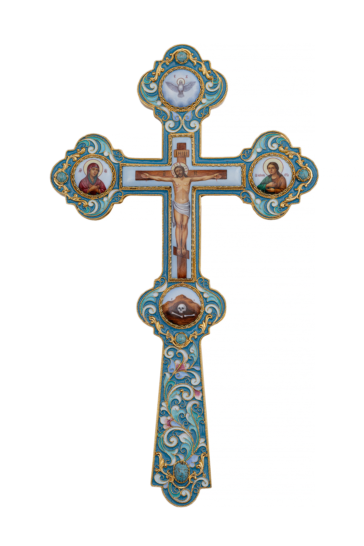 Крест напрестольный №6 сложный малый 5-финифтей, филигрань, эмаль, хим.гравировка / золочение