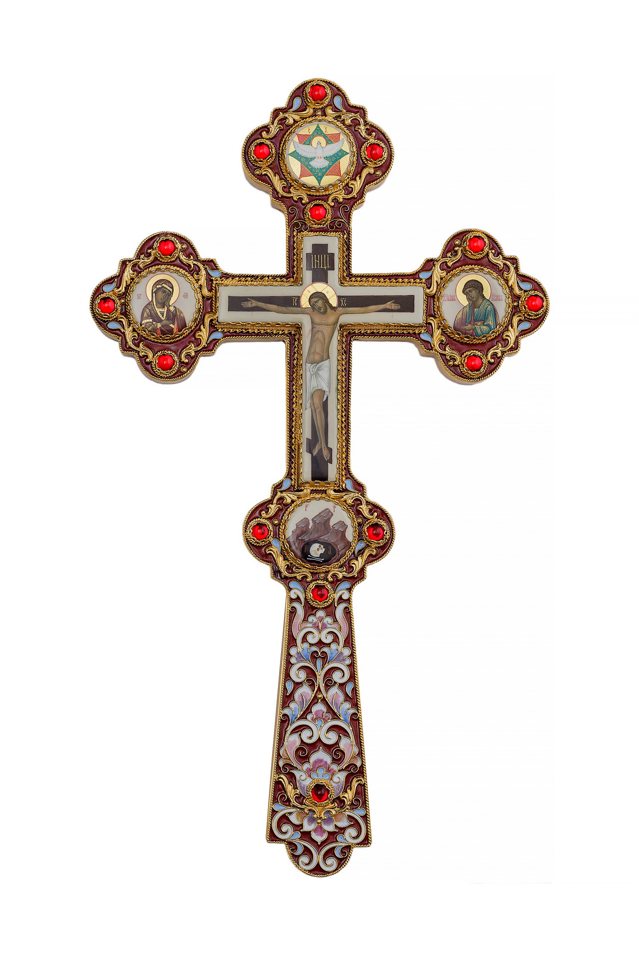 Крест напрестольный №6 сложный малый 5-живописей, филигрань, эмаль, хим.гравировка / золочение