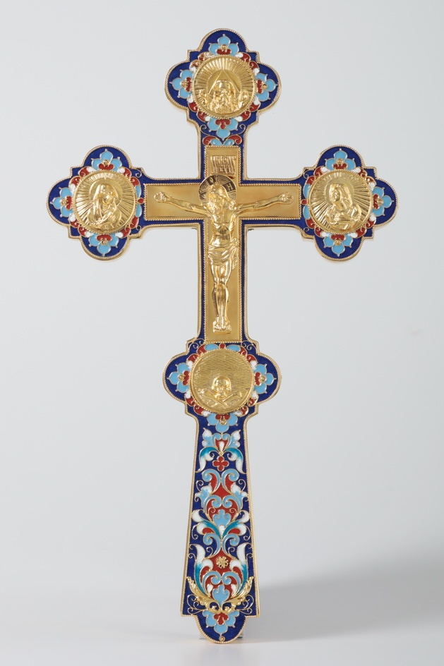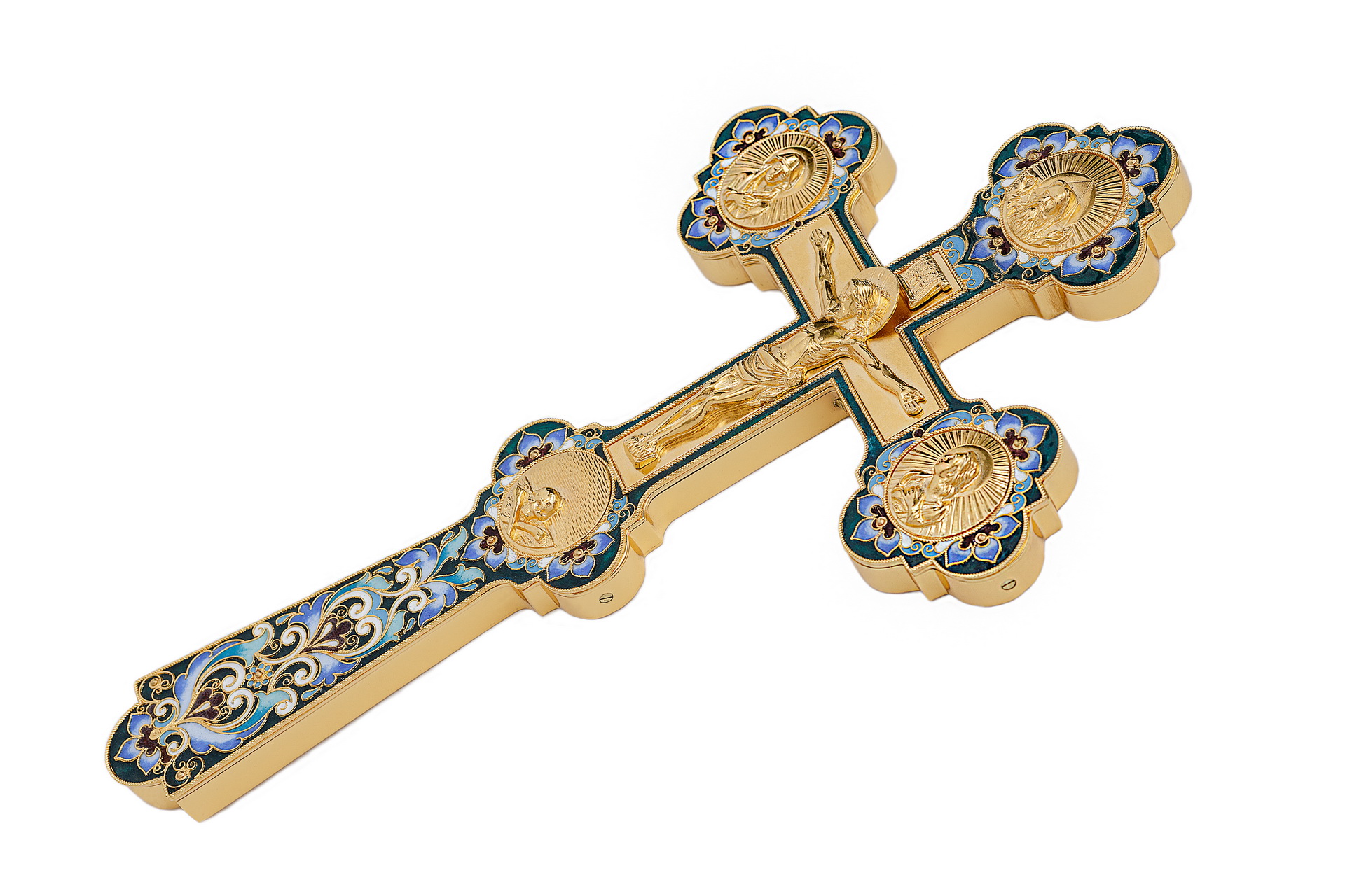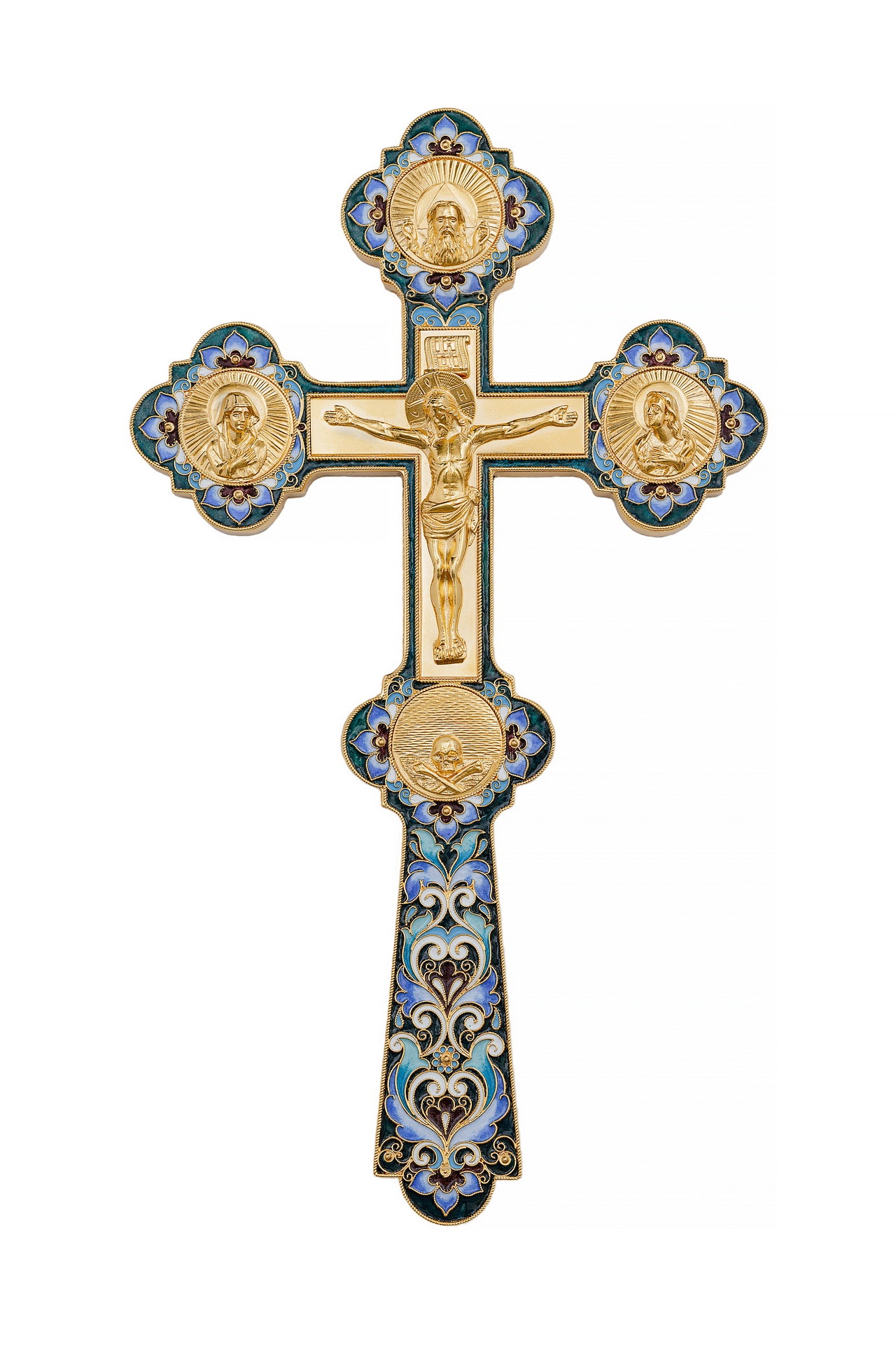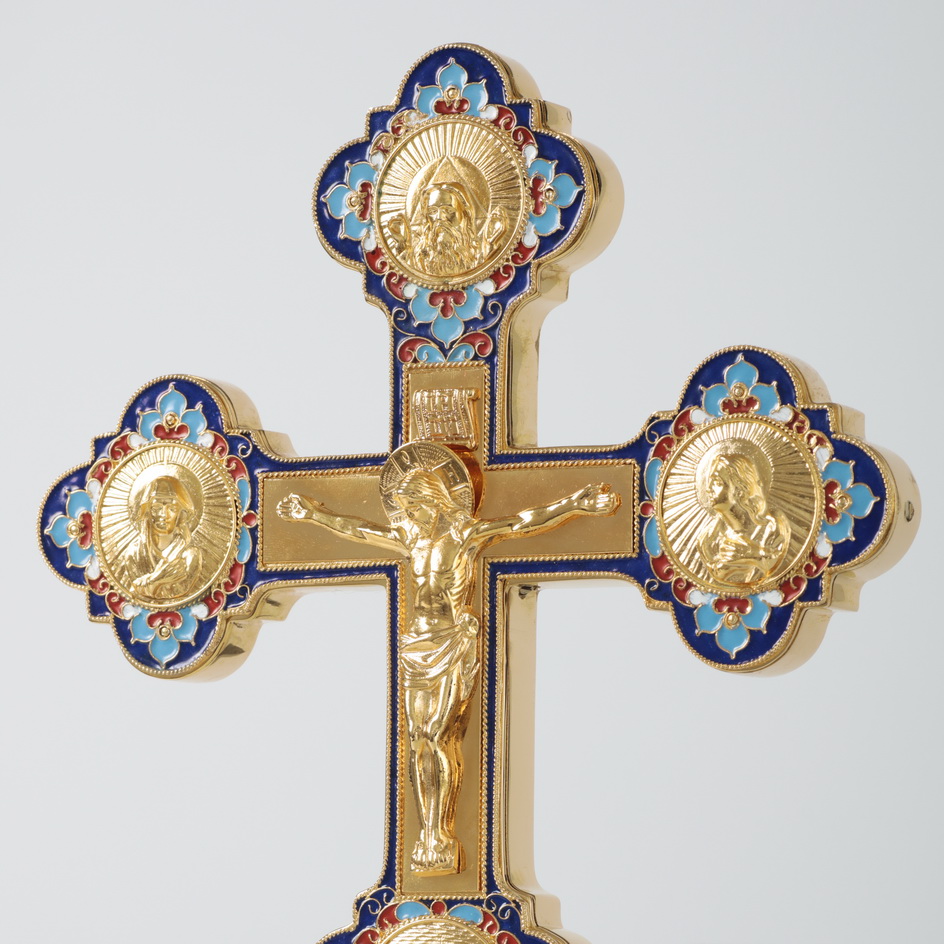 Крест напрестольный №6 сложный малый лики, литьевое распятие, филигрань, эмаль, хим.гравировка / золочение