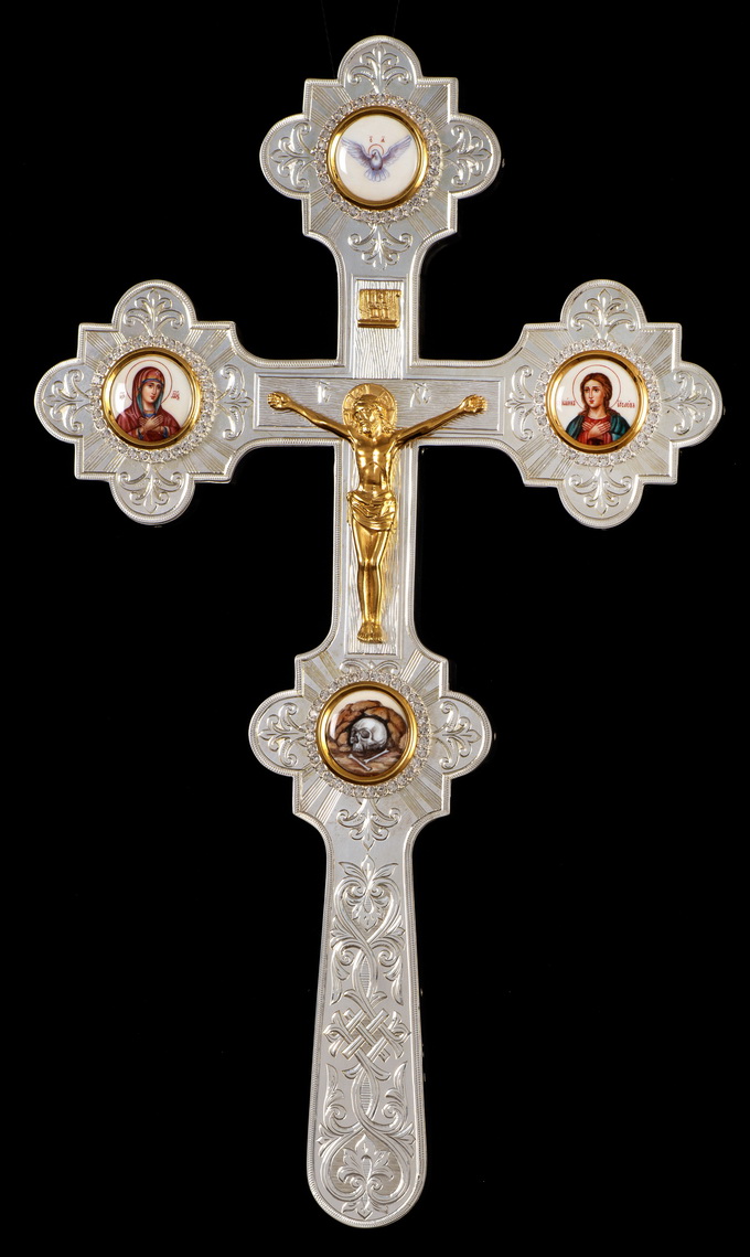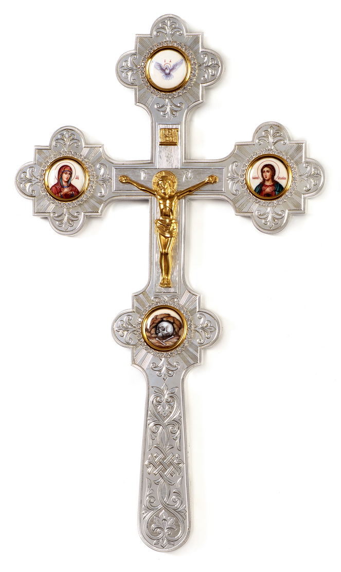 Крест напрестольный №7 4-финифти, распятие, гравировка / золочение / серебро (УИН)