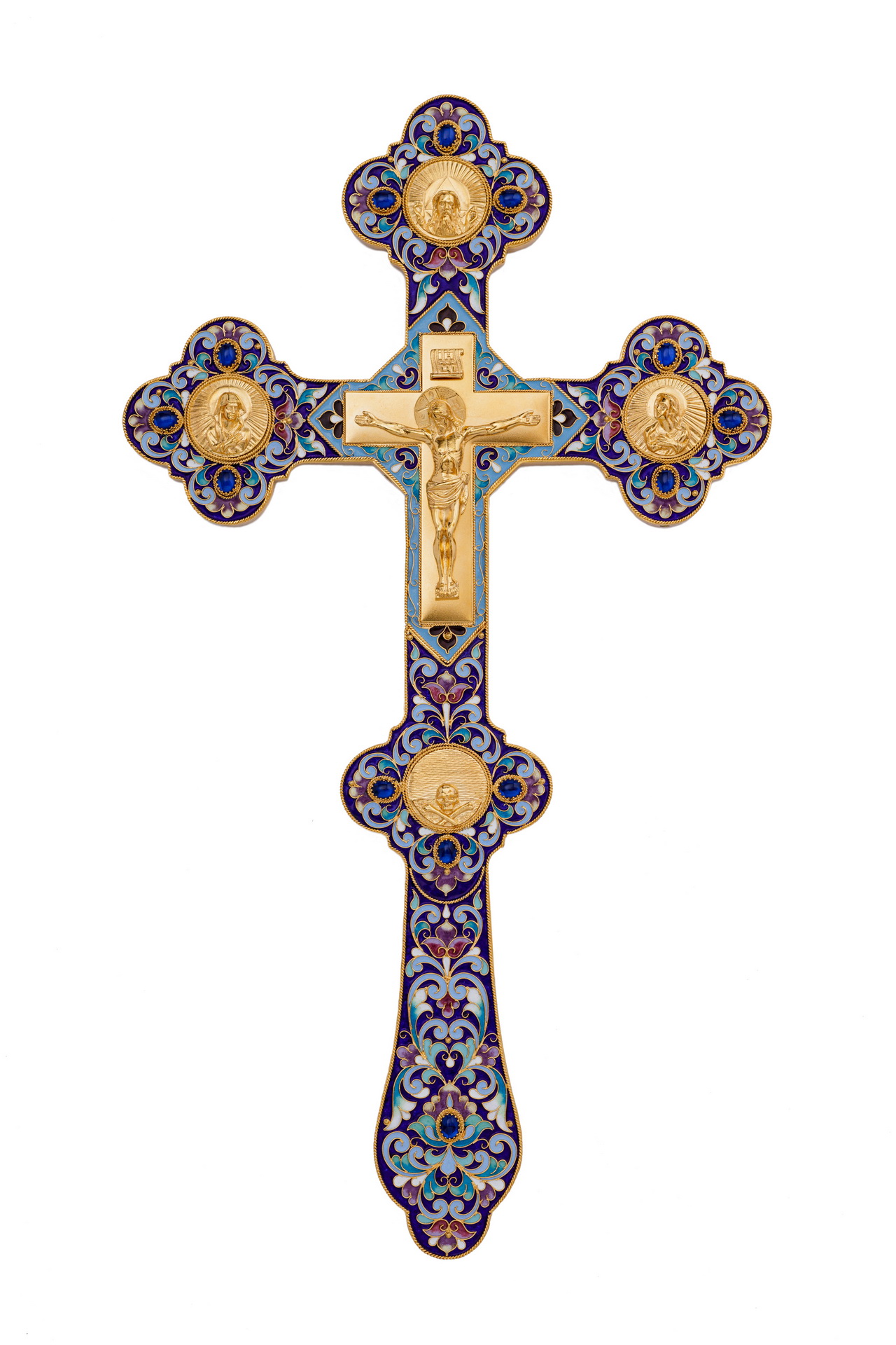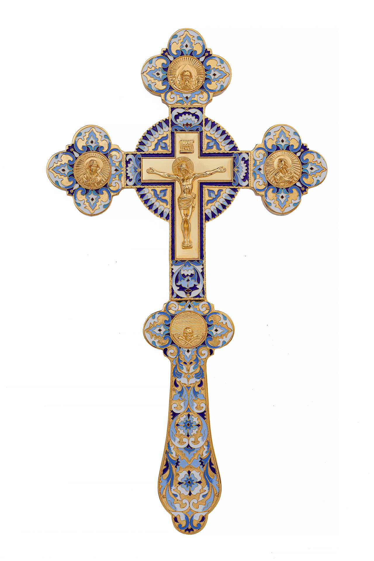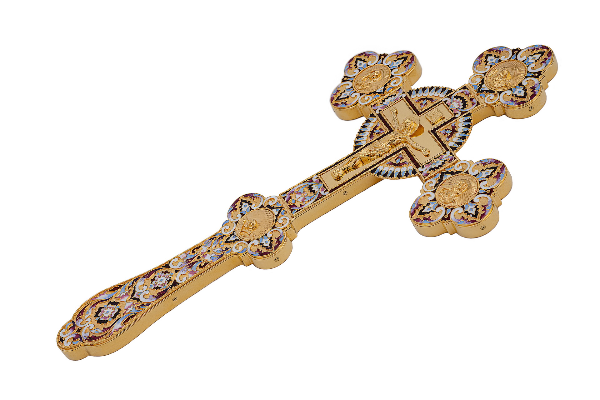 Крест напрестольный №7 литьевые лики, распятие, филигрань, эмаль, хим.гравировка / золочение