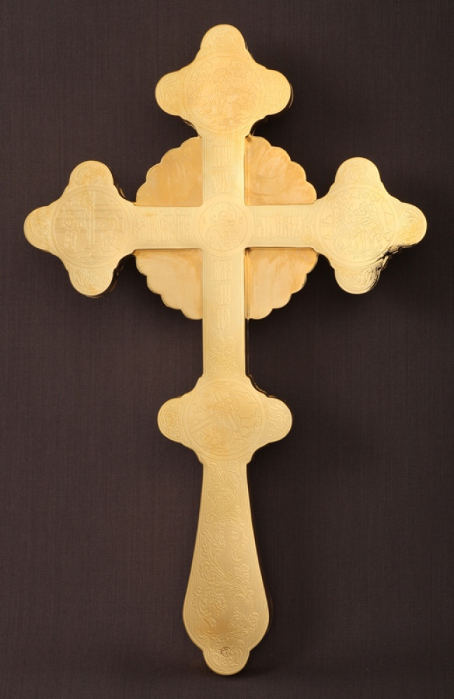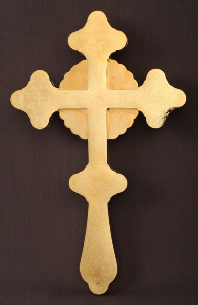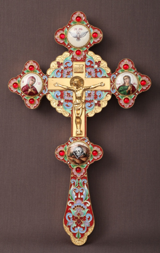 Крест напрестольный фигурный 4-финифти, литьевое распятие, эмаль / золочение