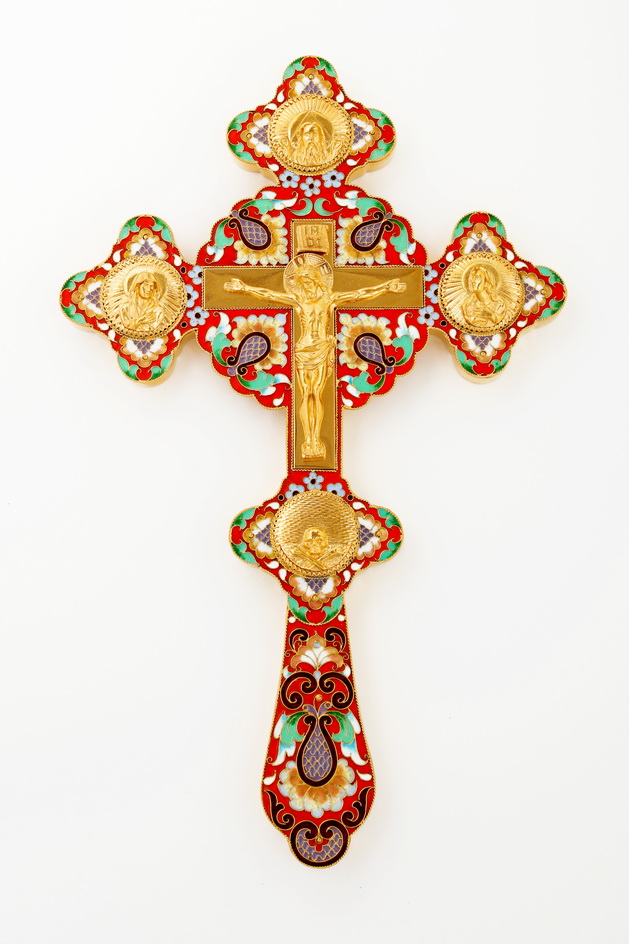Крест напрестольный фигурный литьевое распятие, лики, эмаль / золочение