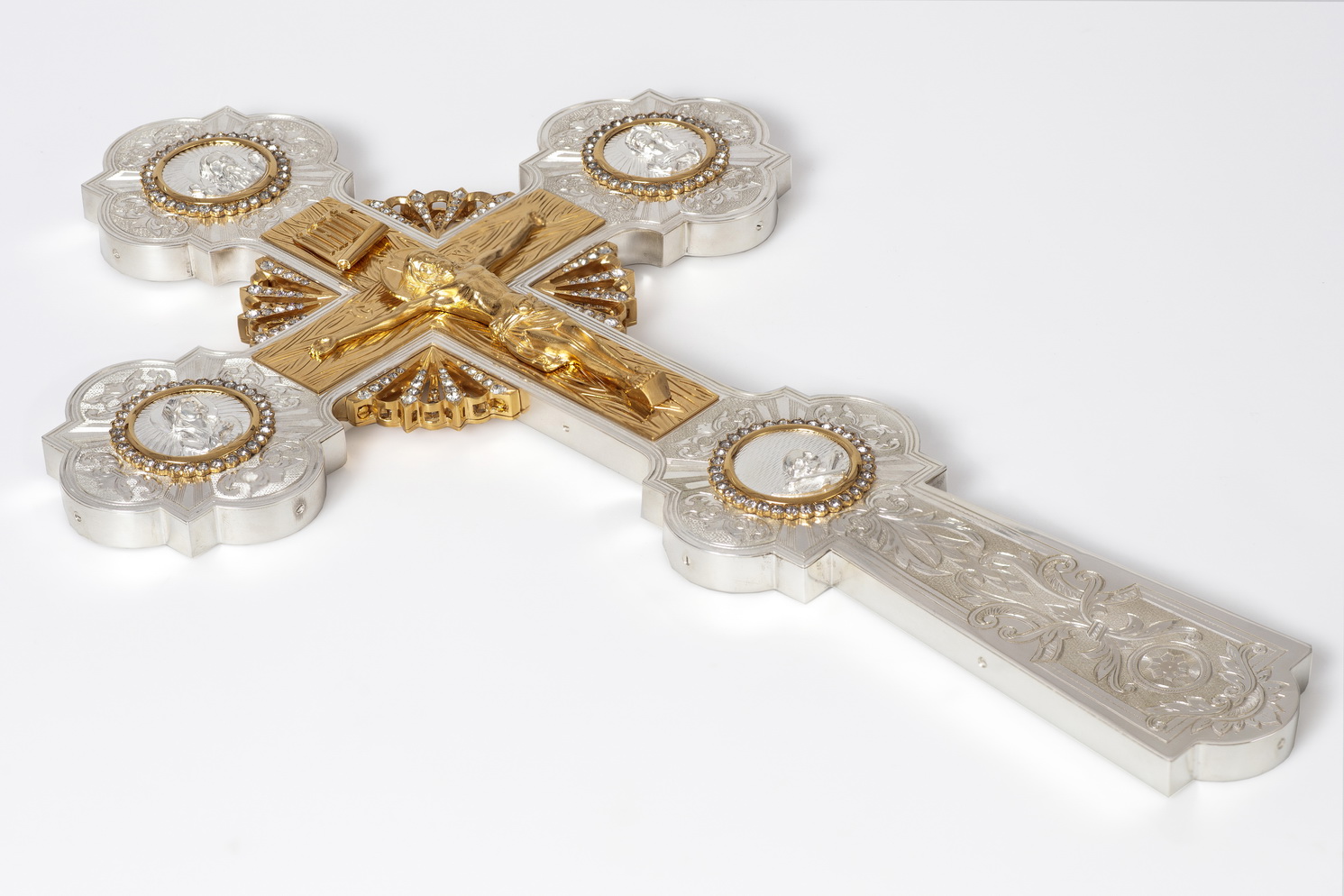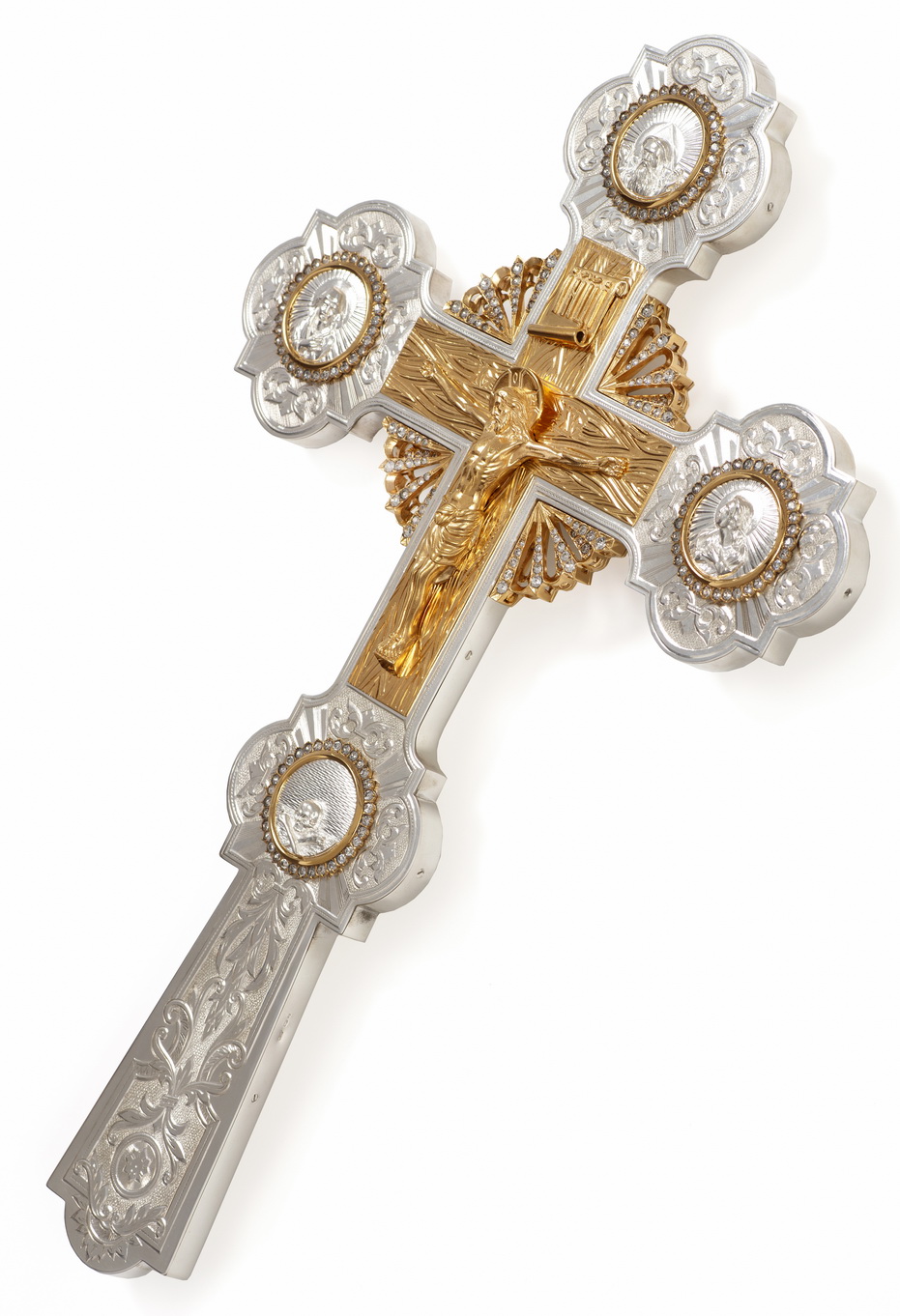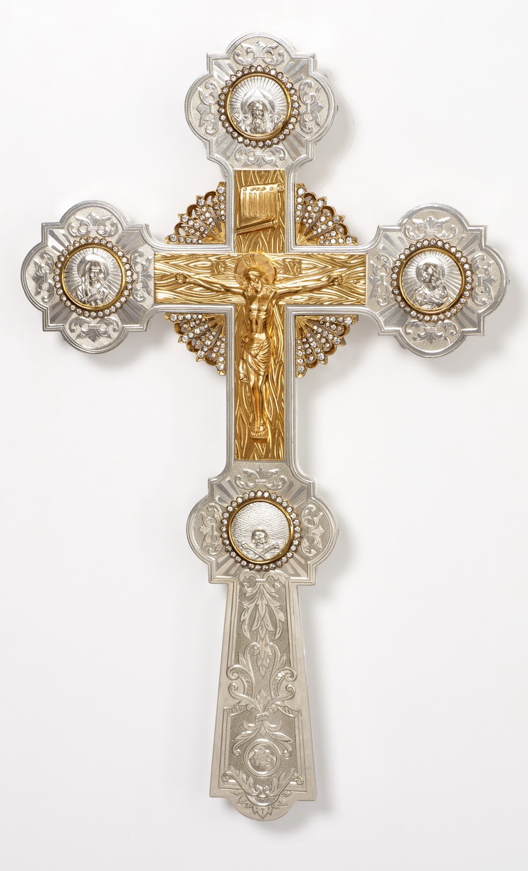 Крест напрестольный литьевые лики, распятие, лучи, гравировка / золочение / серебро (УИН)