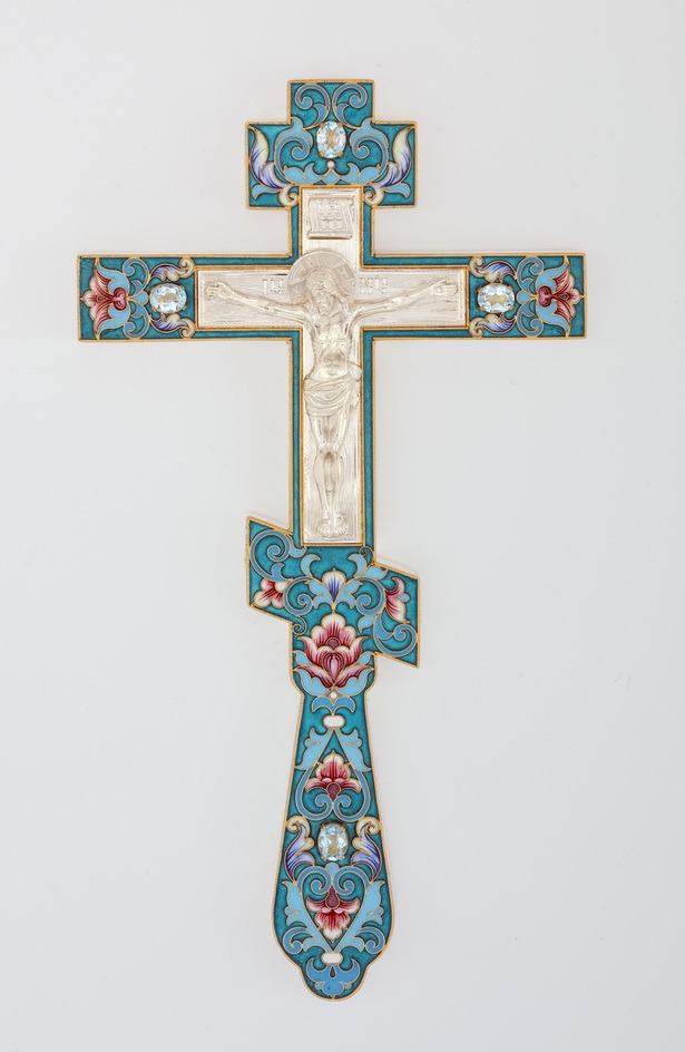 Крест напрестольный малый литье, филигрань, эмаль, роспись, гравировка / золочение / серебро (УИН)