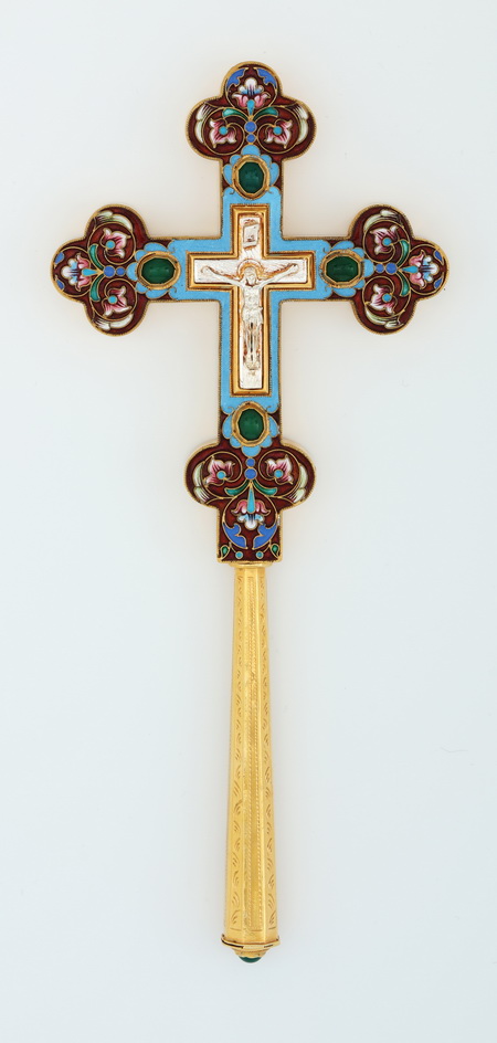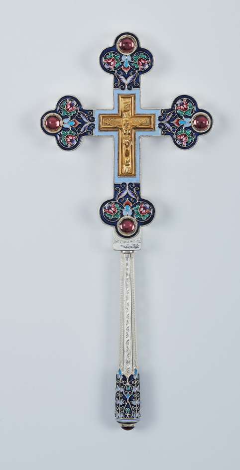 Крест напрестольный водосвятный на ручке литье, филигрань, эмаль, роспись, гравировка / золочение / серебро (УИН)