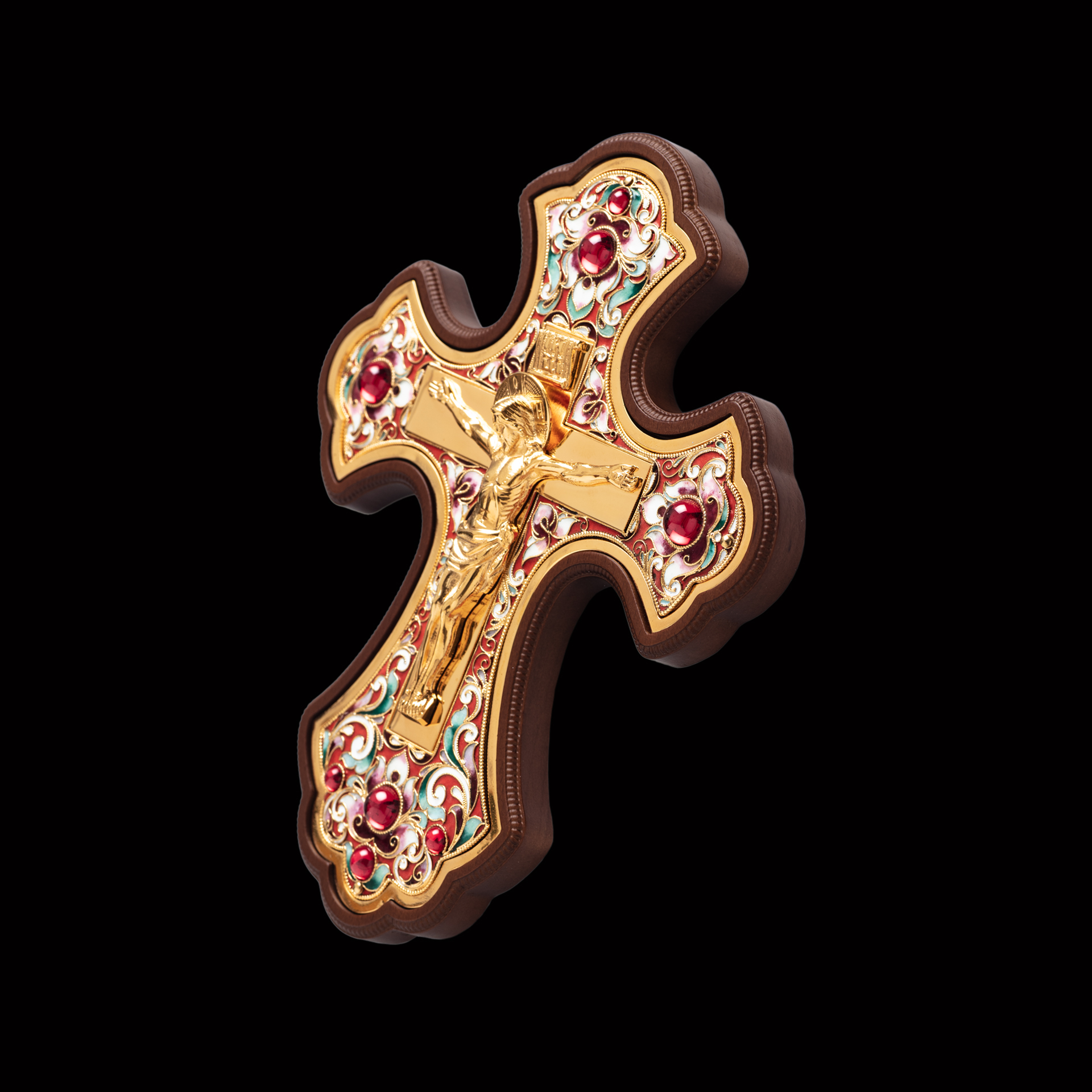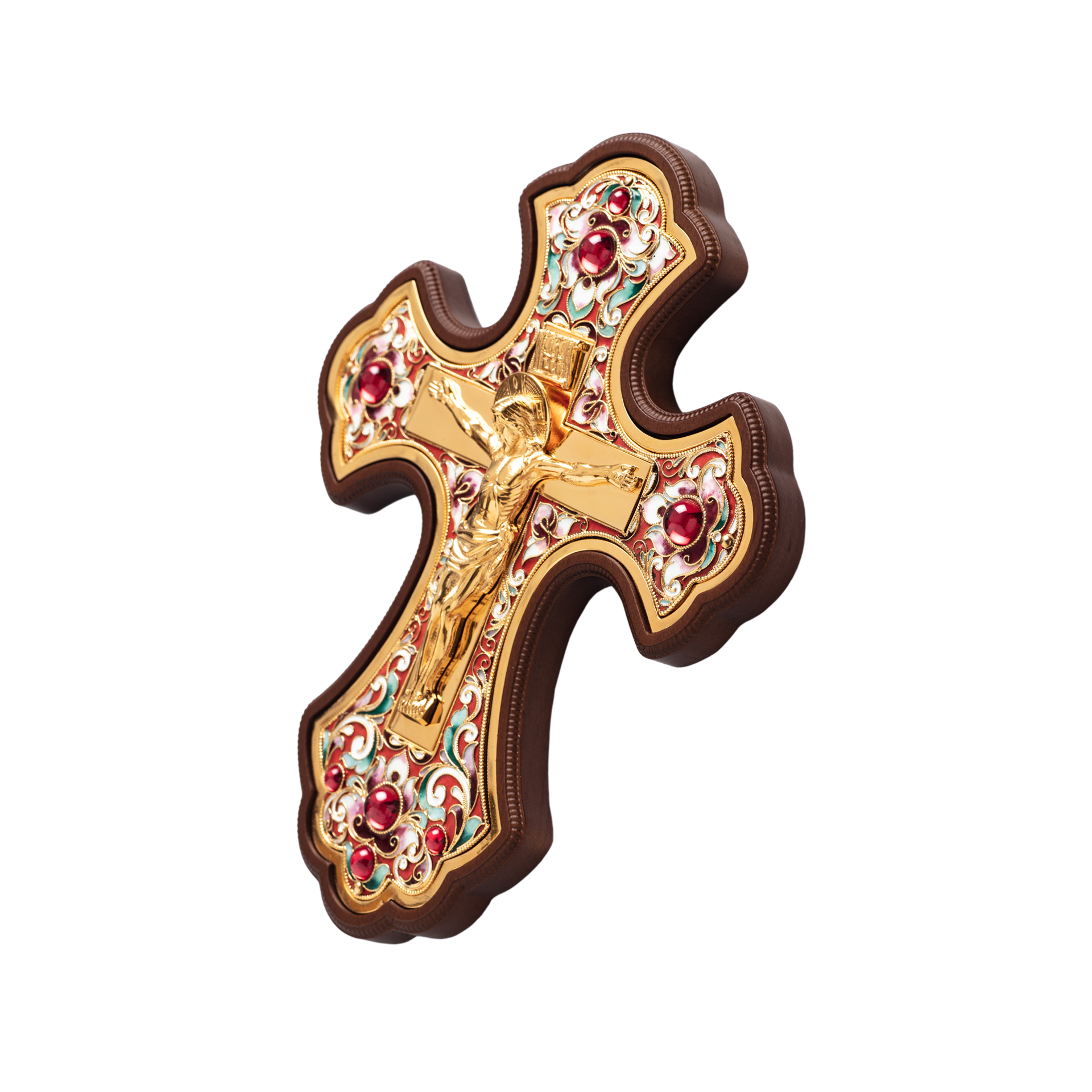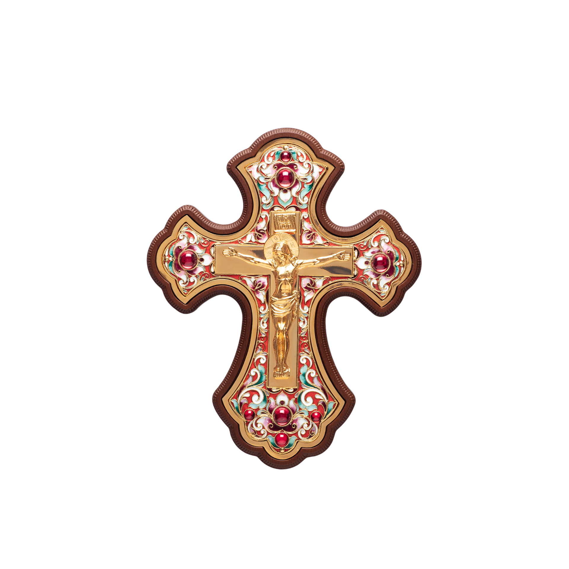 Крест настенный литьевое распятие, филигрань, эмаль в деревянной рамке / золочение