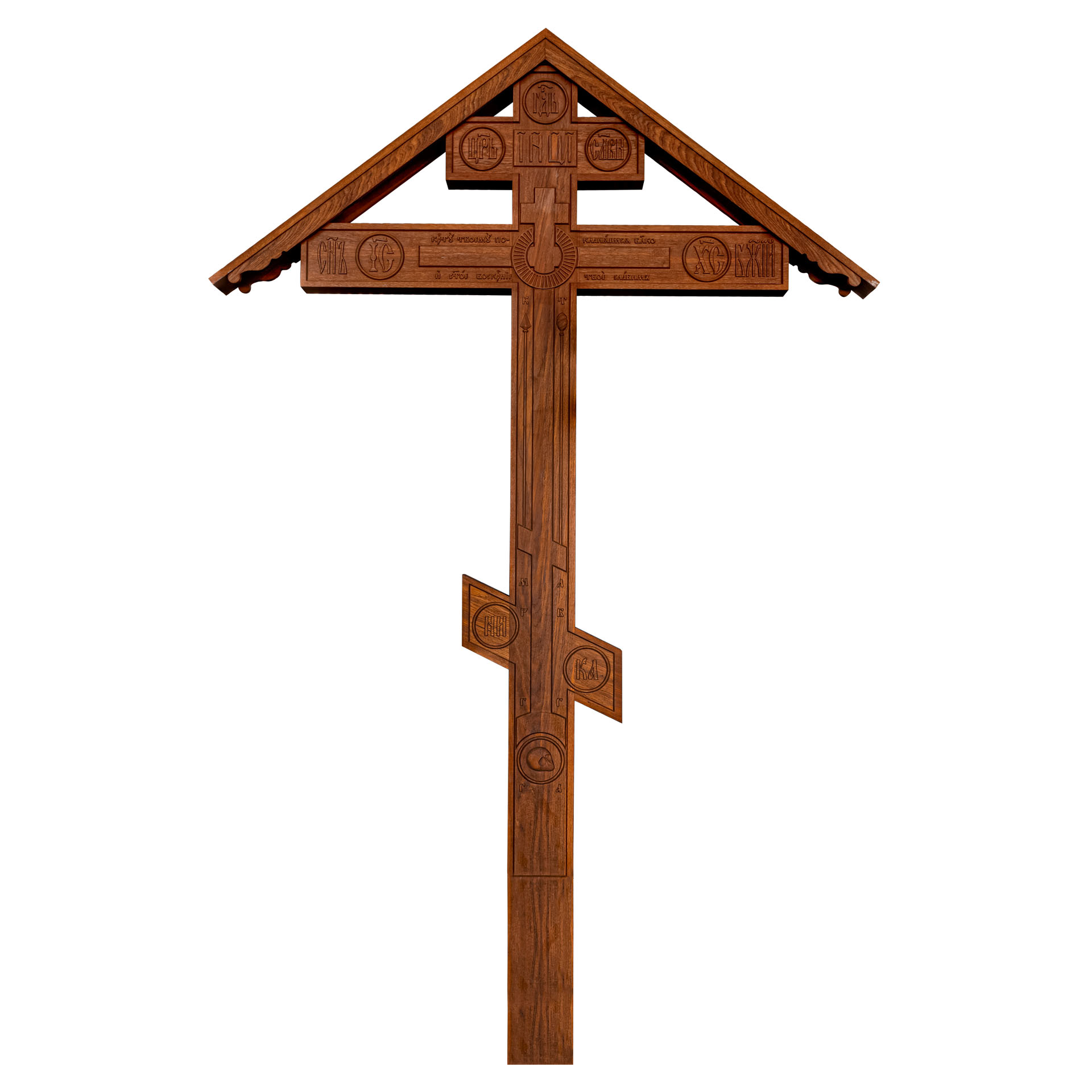 Размеры креста без крыши: Высота - 2525 мм; ширина - 1200 мм; толщина - 80мм; ширина ноги - 150 мм; глубина ноги, входящая в металлическую подставку - 500 мм.