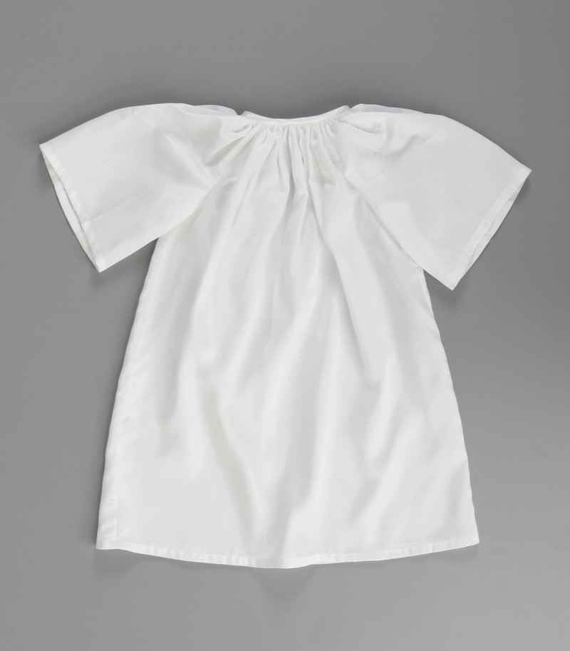 Крестильная рубашка детская свободного силуэта, со сборкой по линии горловины, изготовленная из однотонной натуральной ткани. Застежка - завязки на спинке изделия.