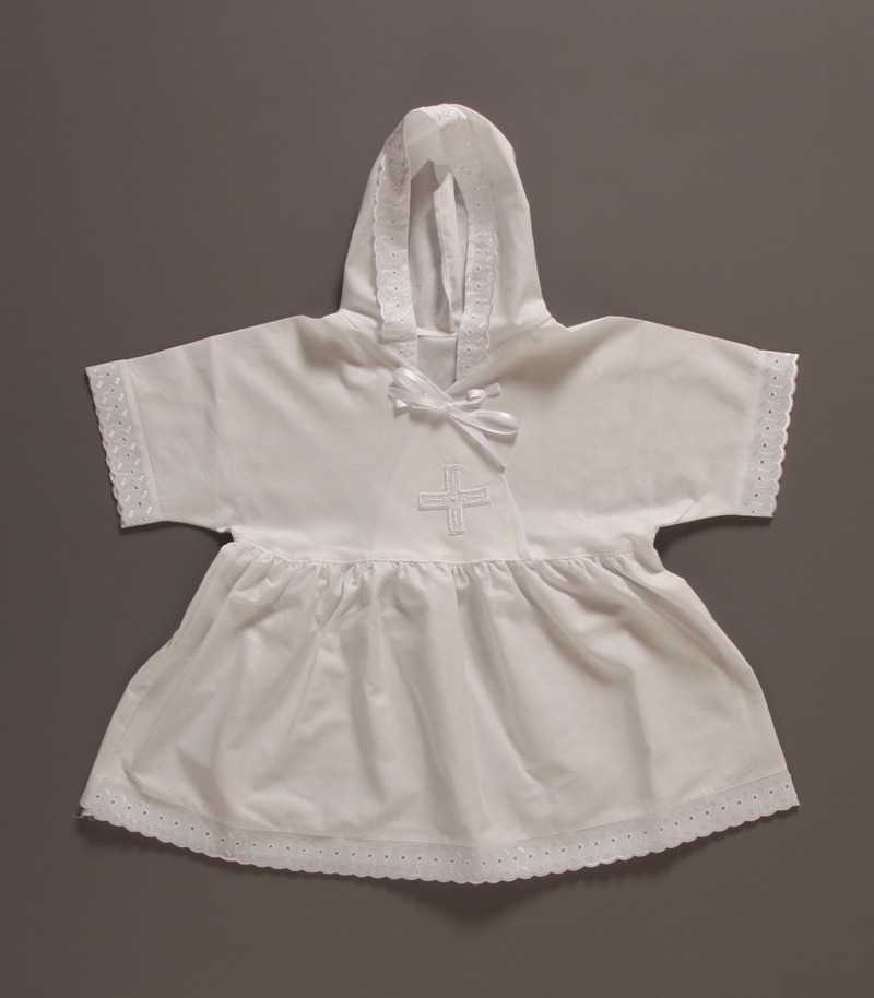 Крестильная рубашка детская с капюшоном, изготовленная из однотонной натуральной ткани. Застежка - завязки спереди.