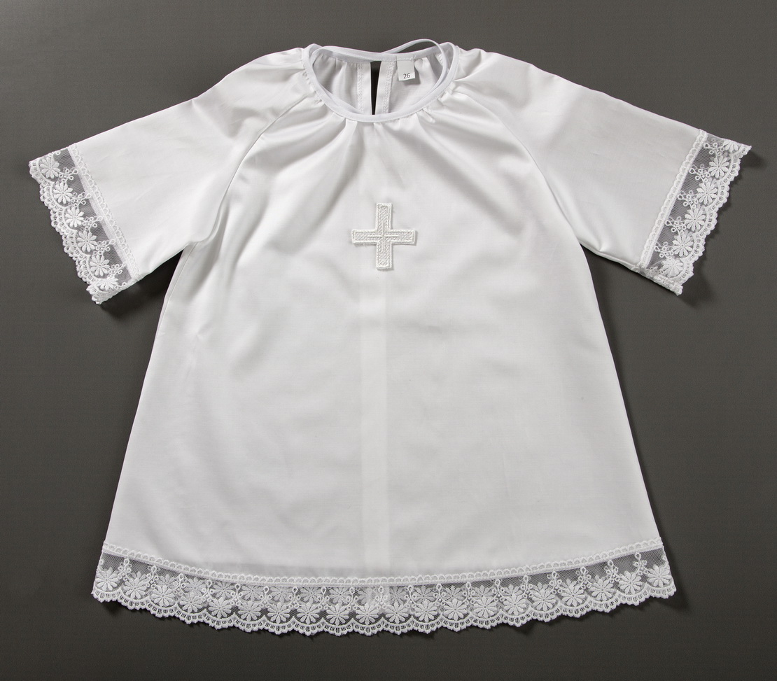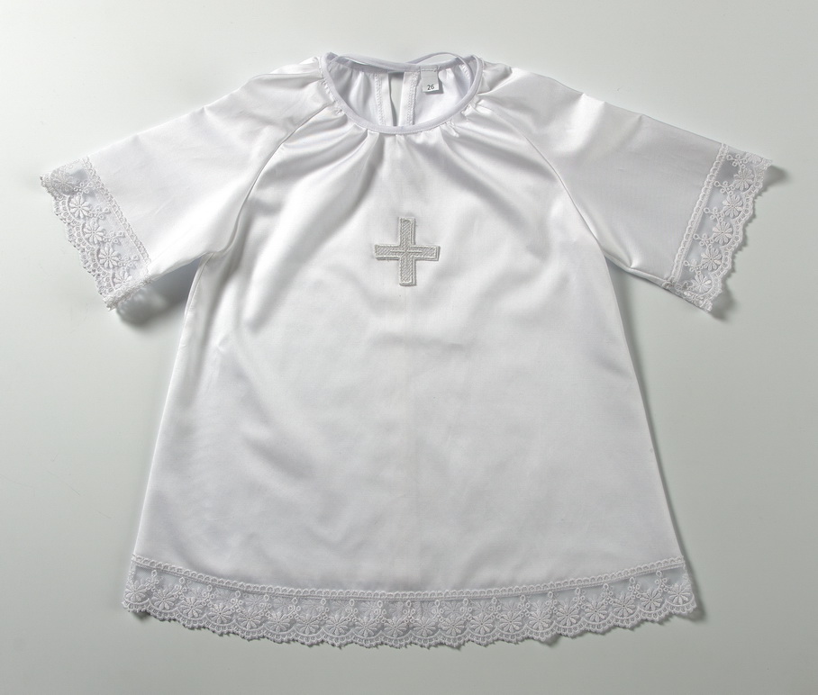 Крестильная рубашка детская, свободного силуэта, с кокеткой-буфами, изготовленная из однотонной натуральной ткани. Застежка - завязки на спинке изделия.