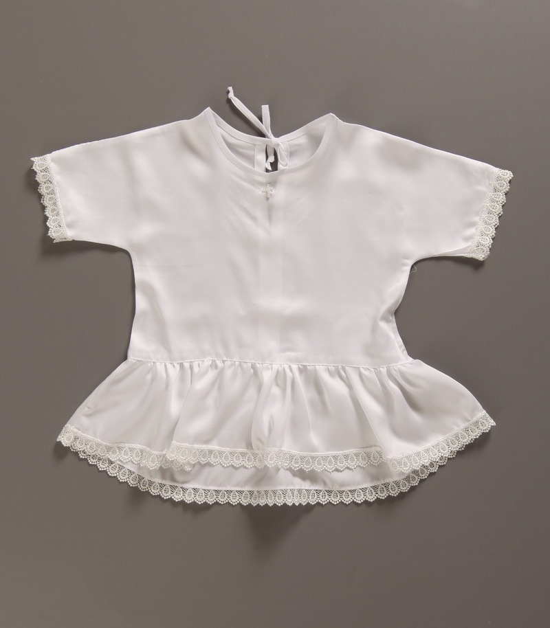 Крестильная рубашка детская, изготовленная из однотонной натуральной ткани. Застежка - завязки на спинке изделия.