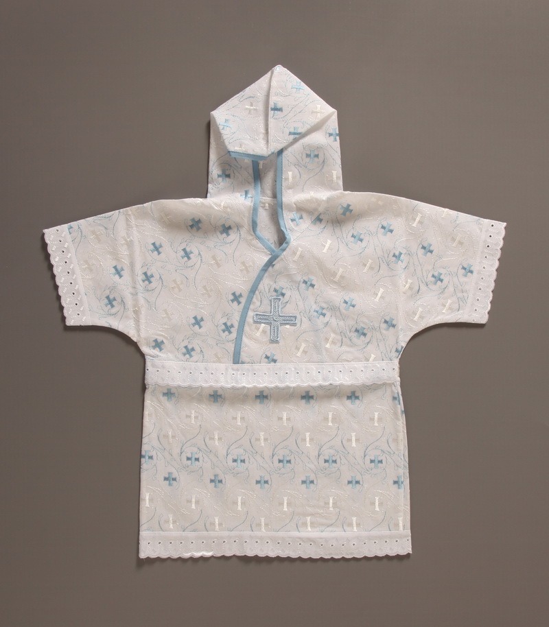 Крестильная рубашка детская с капюшоном, изготовленная из натуральной вышитой ткани.