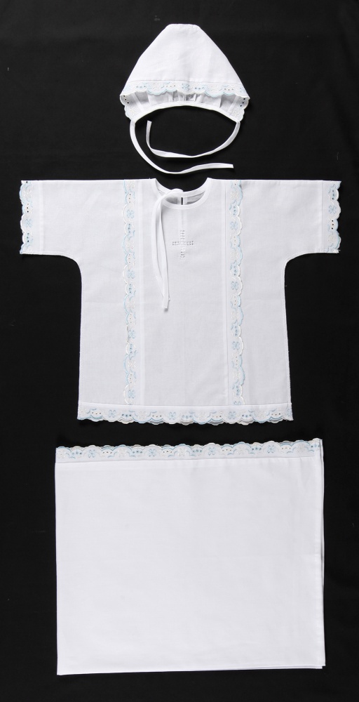 Крестильный комплект изготовленный из натуральной однотонной ткани. В комплект входит: крестильная пеленка-крыжма, крестильная рубашка и чепчик.