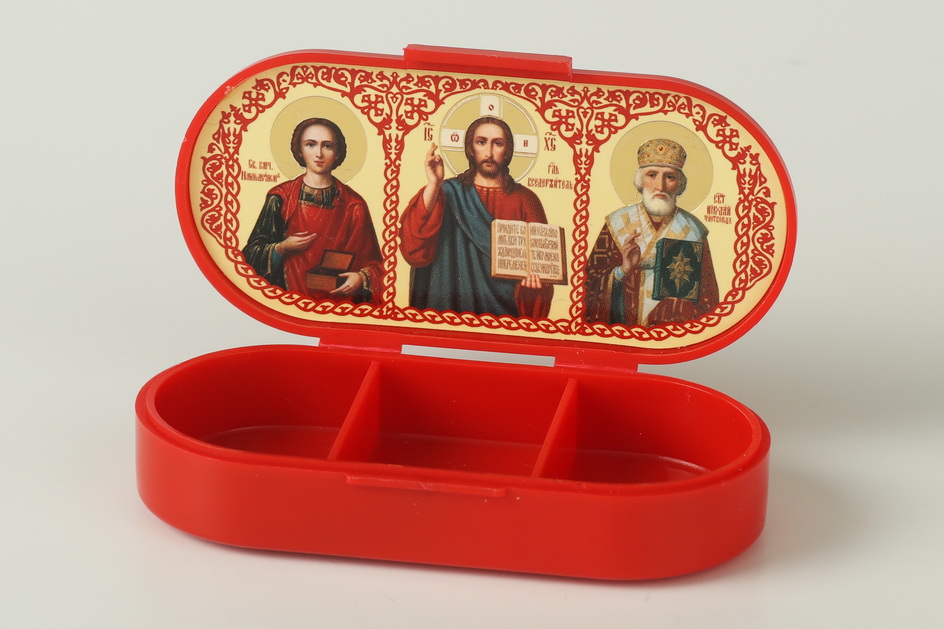 Ладаница (таблетница) красная Пантелеимон-Спаситель-Николай Чудотворец