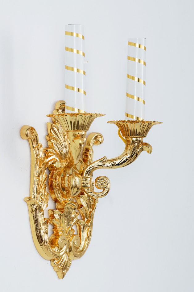 Лампады (бра) комплектуются белыми свечами с золотой полосой (Свеча из жести, покрытая белой эмалью с золотой полосой).