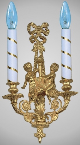 Необычным декоративным элементом данной настенной лампы являются два ангела, изображенные в образе детей. Две белые свечи заканчиваются лампами, по форме напоминающими языки пламени.