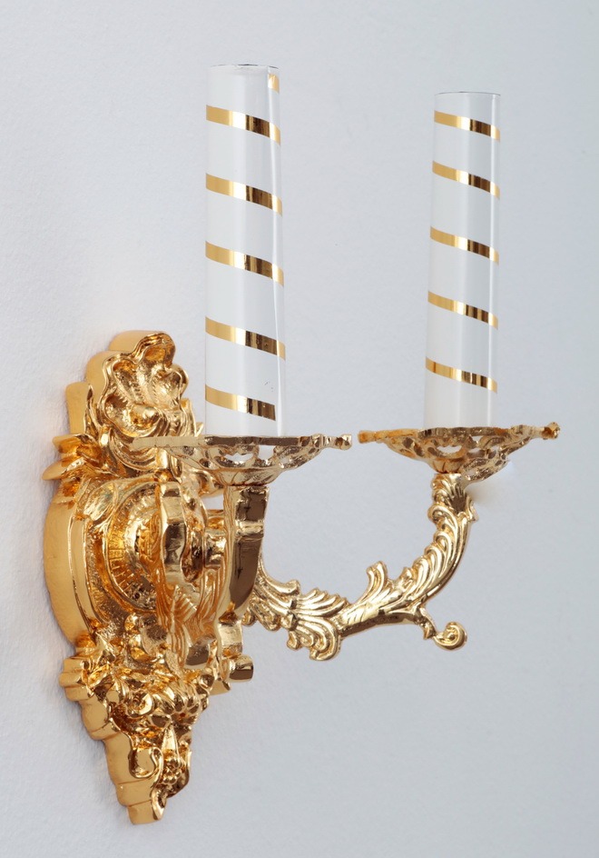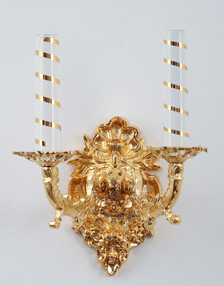 Позолоченная настенная лампа, представляющая собой подсвечник с двумя свечами, имеет торжественный и благородный вид. Украшенное искусными литыми узорами, изделие гармонично впишется в интерьер храма, не привлекая к себе лишнего внимания.