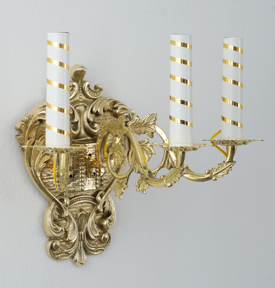 Гармоничная настенная лампа состоит из узорчатого литого основания и трех свечей, украшенных золотыми лентами под цвет основания.