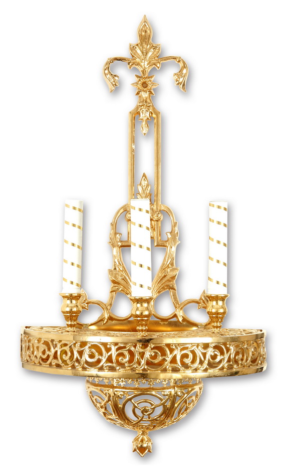 Необычная настенная лампа по форме напоминает полукруглый церковный подсвечник с тремя зажжёнными свечами белого цвета. Весь светильник представляет собой металлическое кружево, которое смотрится легко и воздушно.