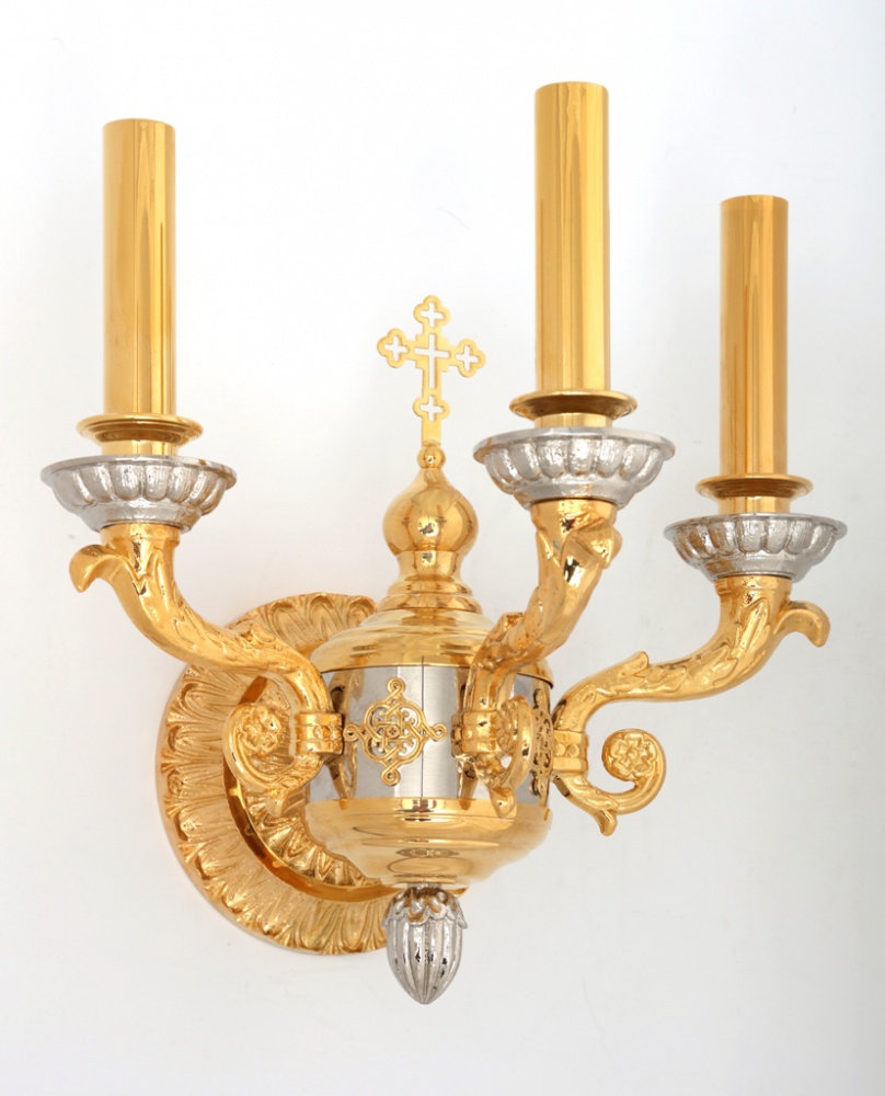 Царственная и изысканная, данная настенная лампа станет не только источником света, но и украшением храма. Некоторые детали позолоченного светильника выделены серебряным цветом, что добавляет изделию контрастность и объем. В центре между свечами расположен восьмиконечный крест, который во время богослужения будет красиво и равномерно подсвечиваться с трех сторон.