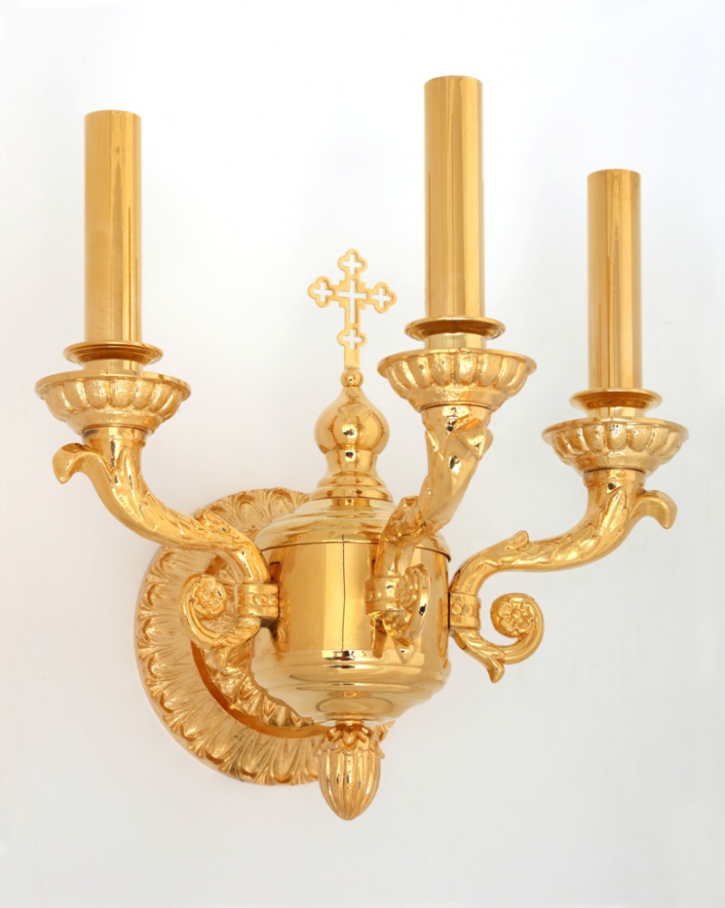 Благородная и минималистичная настенная лампа станет не только источником света, но и украшением храма. В центре между тремя свечами расположен золотой крест, который во время богослужения будет красиво и равномерно подсвечиваться. Изделие выполнено из латуни и меди методом литья и гальванопластики.