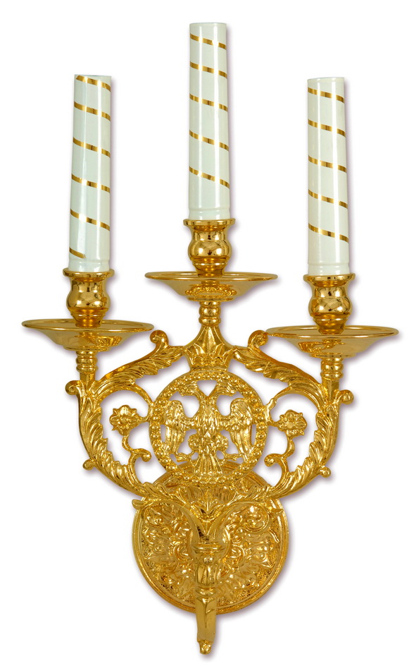 В литое основание данной настенной лампы вплетено изображение двуглавого орла, изображенного на гербе нашей страны. Этот элемент декора будет особенно удачно смотреться в храмах воинской славы, объединяя в себе церковную и светскую символику.