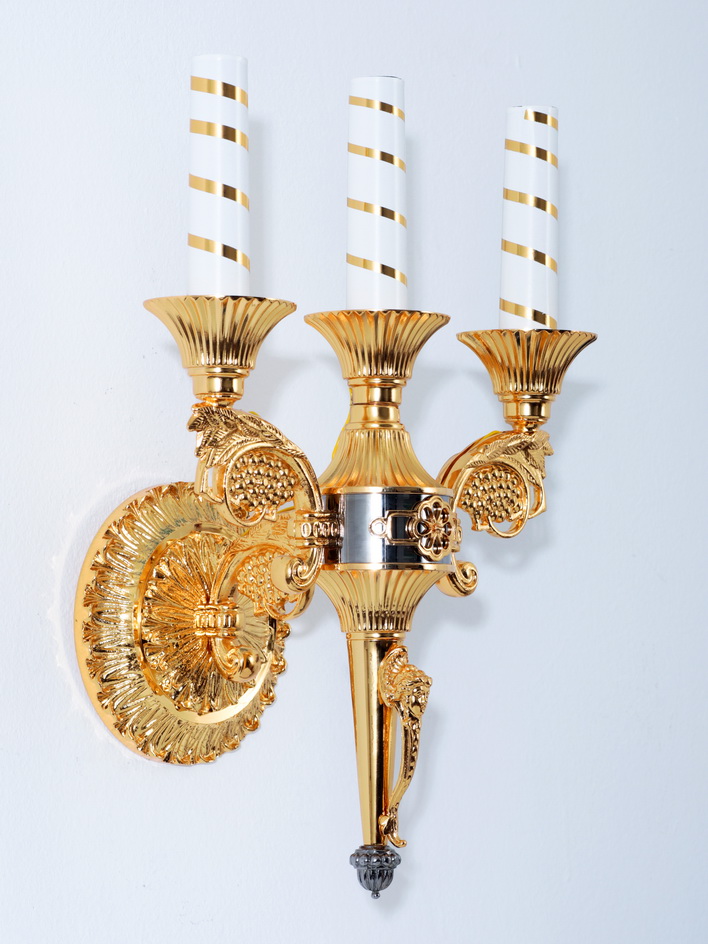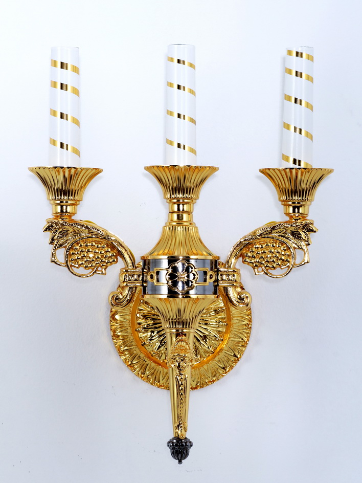 Благородная настенная лампа состоит из круглого основания, которое крепится к стене, и подсвечника с тремя свечами. В изделии красиво сочетаются цвета золота и серебра, дополняя и оттеняя друг друга. В основание подсвечника вплетены гроздья винограда, которые часто встречаются на иконах и в росписи храма.