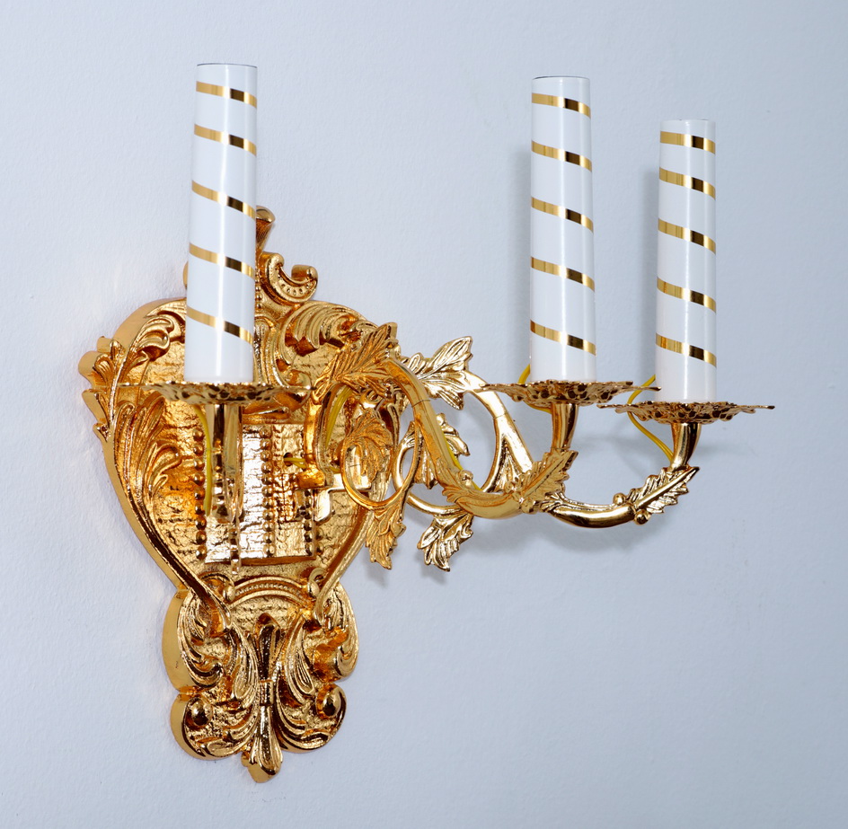Классическая настенная лампа состоит из узорчатого литого основания и трех свечей. Благодаря тому, что расстояние между свечами довольно большое, светильник будет хорошо освещать полутемный храм.